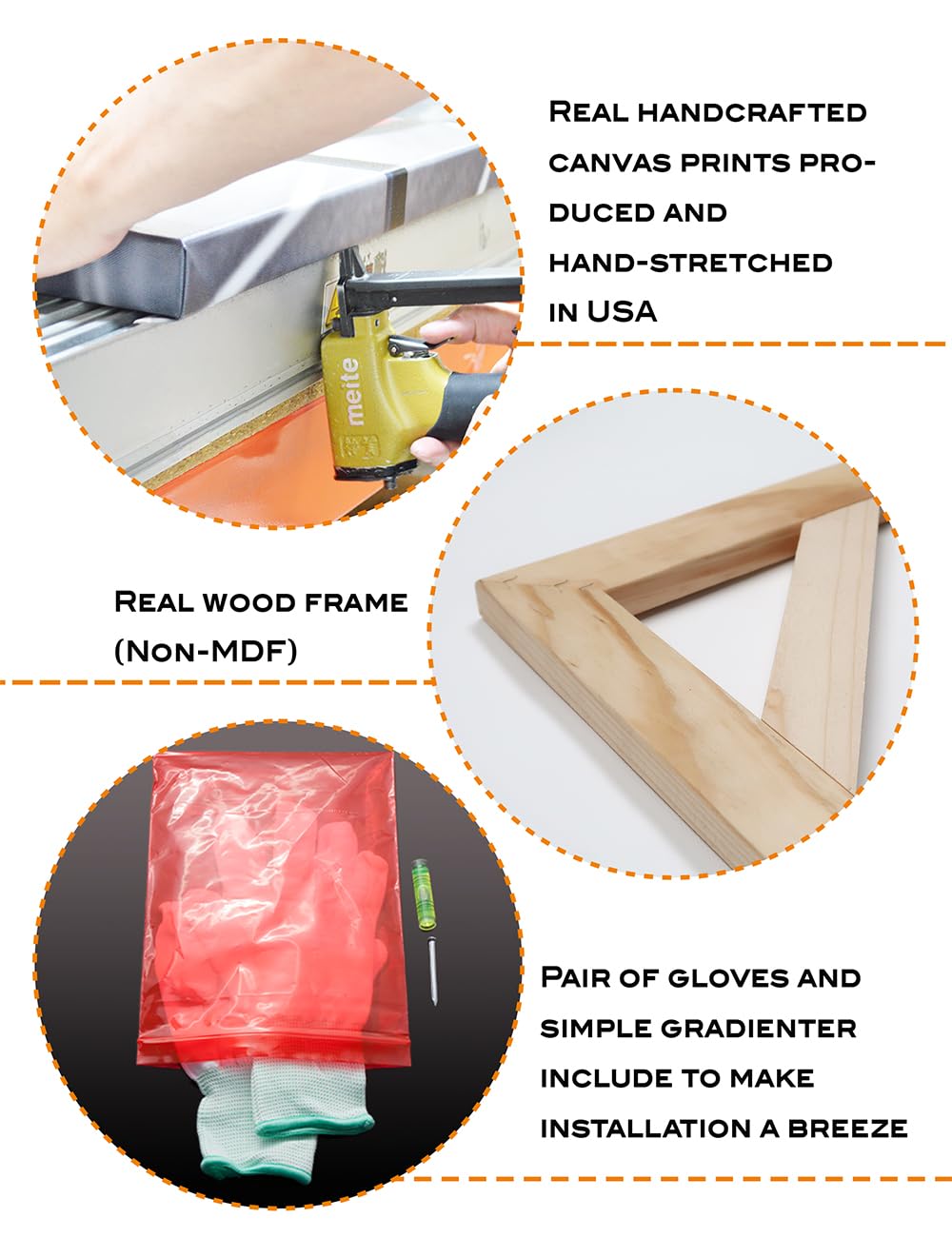 • Q: Does this product come ready to hang? A: Yes, the canvas print is ready to hang and comes with complimentary professional wall art hanging tools, including gloves, nails, and a level.