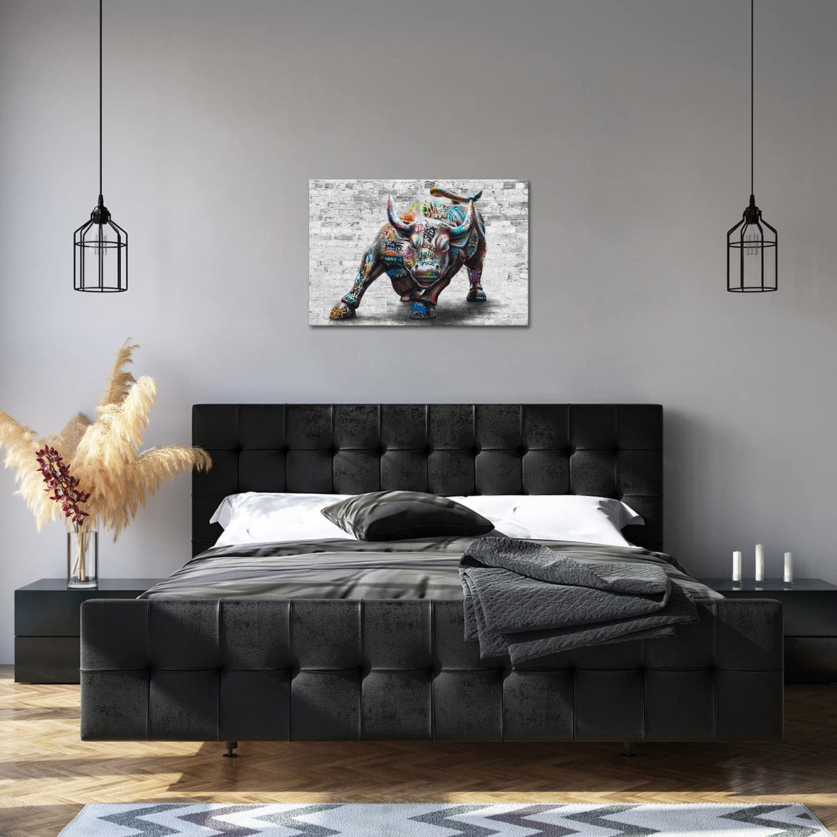 - Q: What type of art style does this canvas represent? A: This canvas features a vibrant, graffiti-covered bull design, blending street art with contemporary decor.