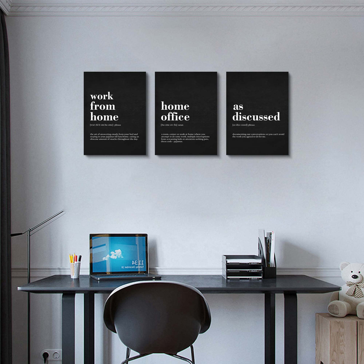 - Q: What are the dimensions of the Framed Office Decor Canvas Wall Art set? A: The dimensions of the canvas wall art set are 12 inches by 16 inches for each of the three pieces.