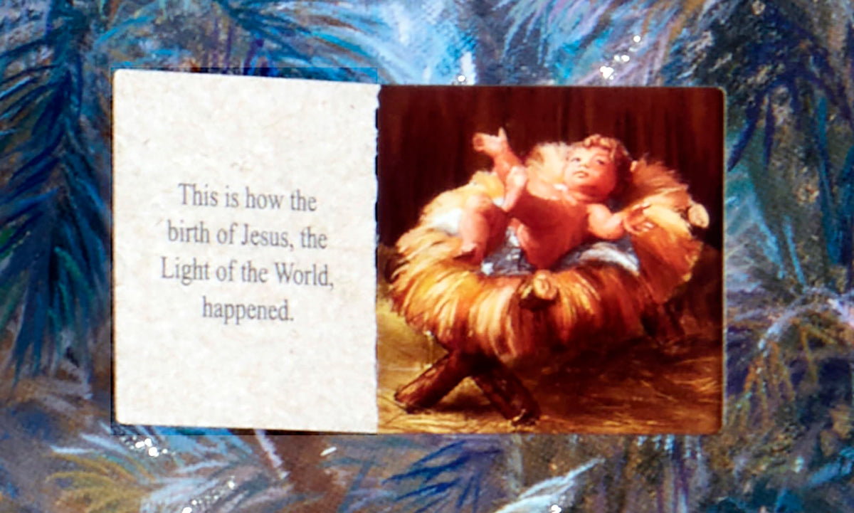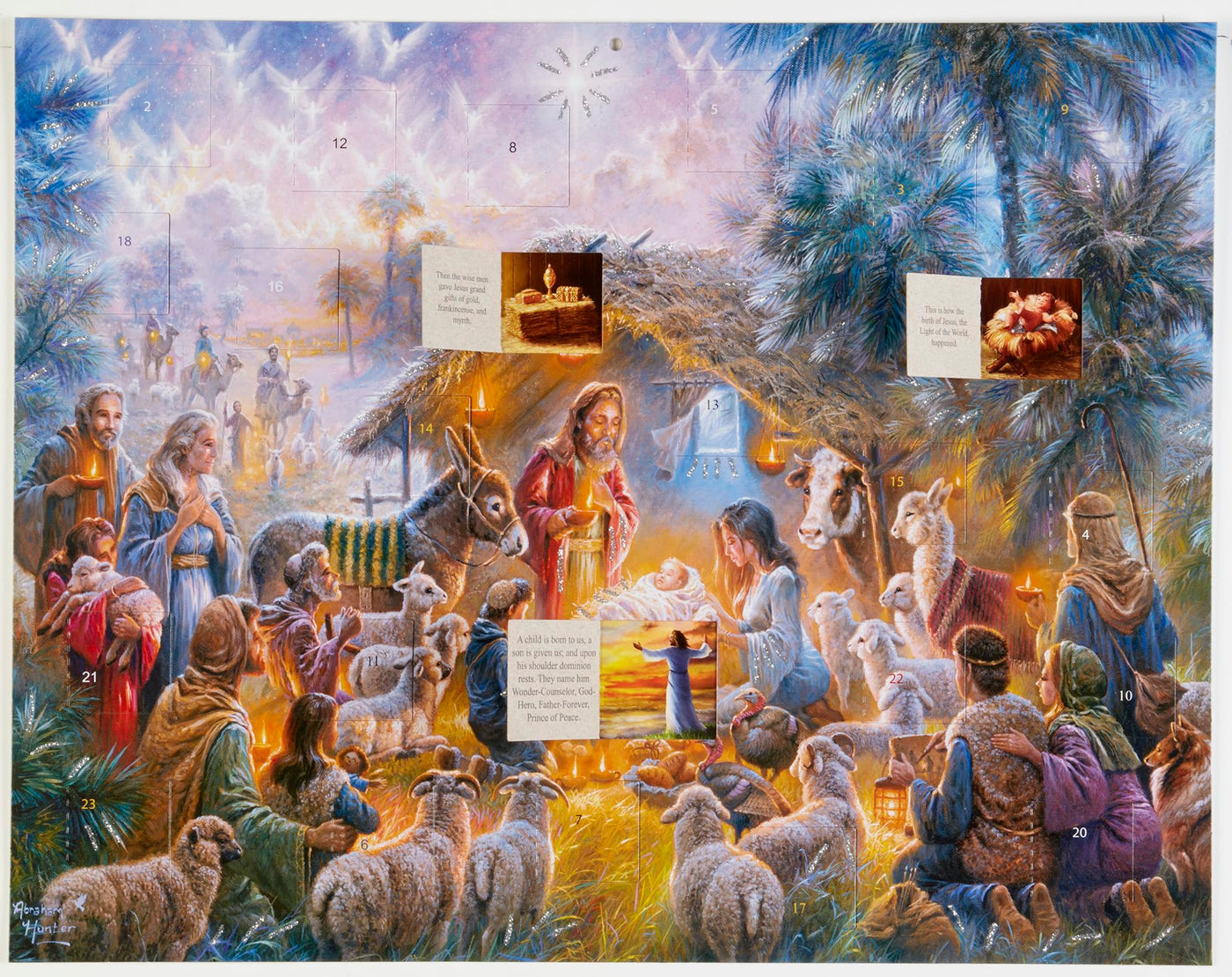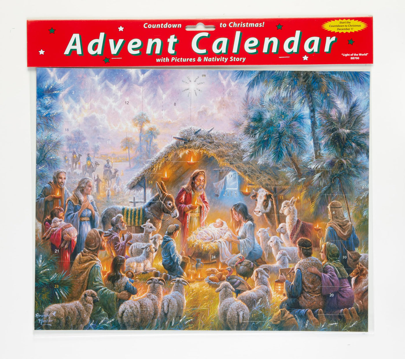 Advent calendars, also sometimes called countdown to Christmas calendars, help build the anticipation for Christmas. This traditional Advent calendar, made of paperboard, has 24 windows to be opened each day beginning on December 1. Behind each window, find text that follows the story of the Nativity and a corresponding picture. The front is accentuated with glitter, and the calendar measures 14x11. The lovely artwork for this design was created Abraham Hunter. Easy to hang or display anywhere. Rekindle an old family tradition or start a new one!