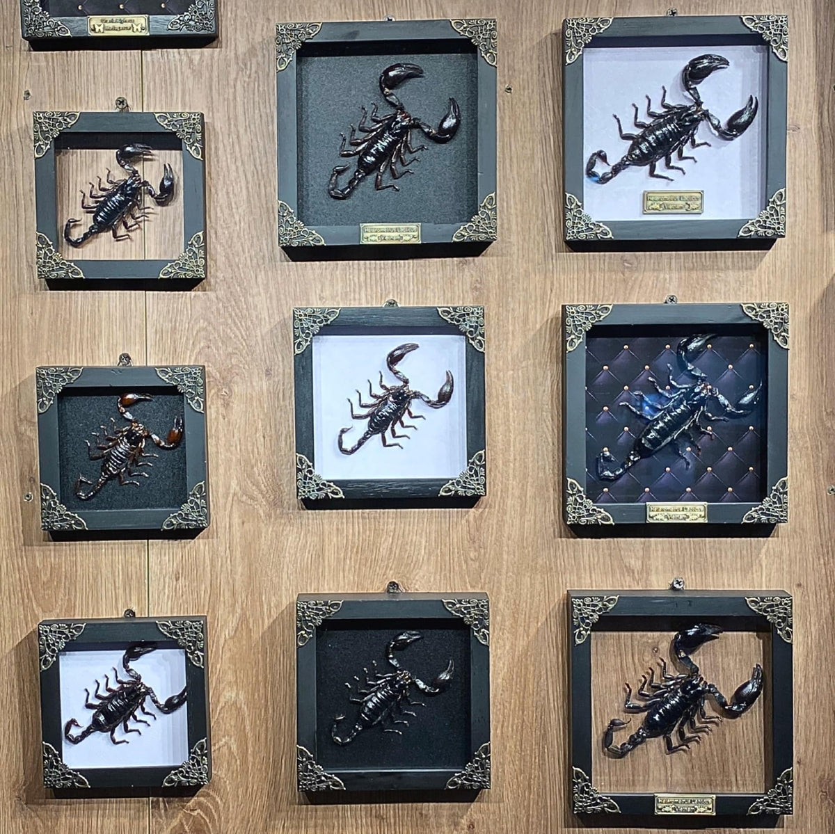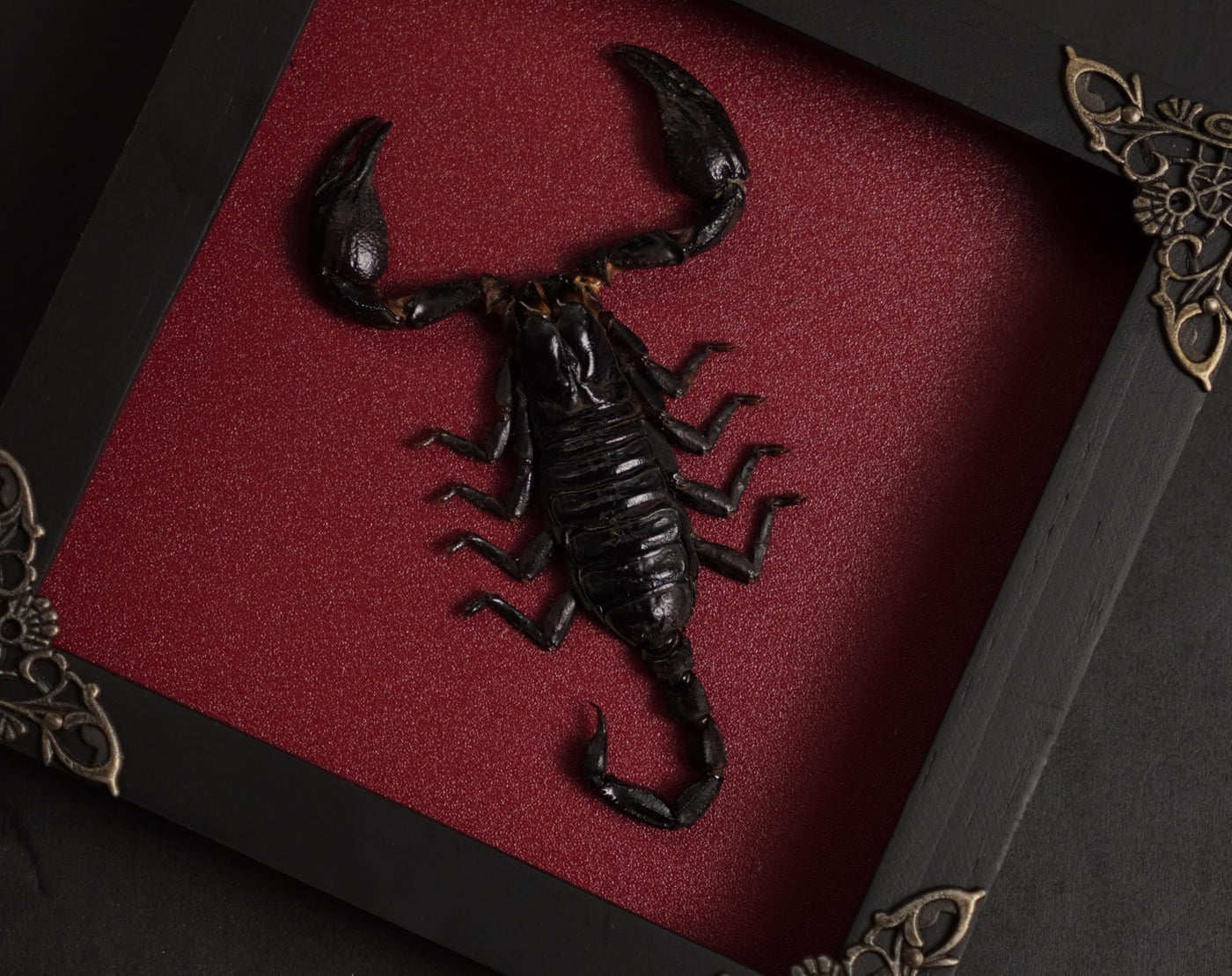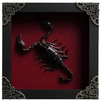 This handmade shadow box features a real preserved scorpion, carefully prepared and framed in a black wooden display. Each specimen is stored to maintain its original color and natural shape, making every piece unique. The pinewood frame is finished with protective acrylic glass, brass corner protectors, and a hanger on the back, so it is ready to display straight out of the box. With its vibrant natural details, this taxidermy frame adds a striking touch to any interior d cor, from gothic and spooky aesthetics to natural science displays. It also serves as an educational tool for children and collectors to explore the beauty of entomology. Perfect as a gift, each piece comes in elegant packaging, making it ideal for birthdays, anniversaries, Halloween, or any special occasion. Whether for a loved one, a collector, or a curious learner, this preserved insect artwork is sure to impress. We ensure every frame is securely packaged and delivered in the best possible condition. If you encounter any issue with your order, please do not hesitate to contact us for assistance.