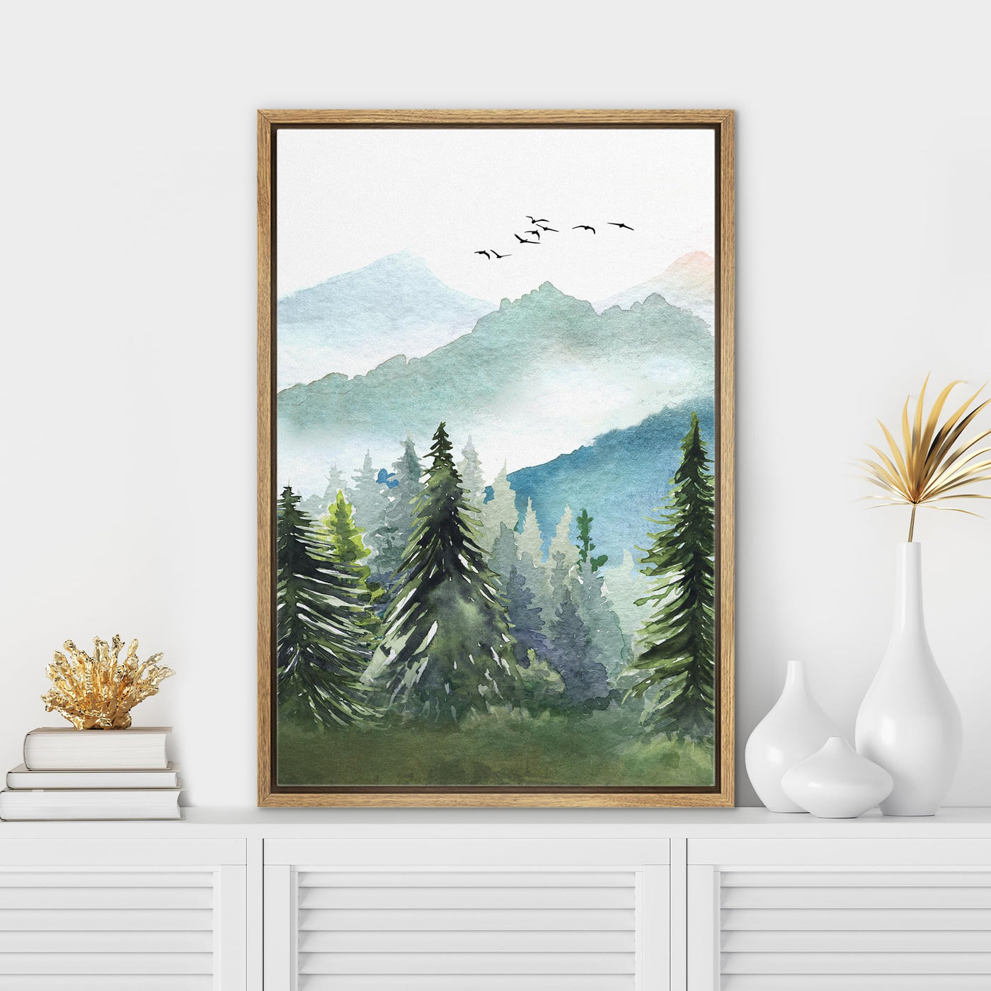 SIGNWIN Framed Canvas Print Wall Art Watercolor Green Forest Tree Mountain Range Nature Landscape Prints Modern Art Woodland Nursery Decor for Living Room Bedroom Office - 24''x36'' NATURAL