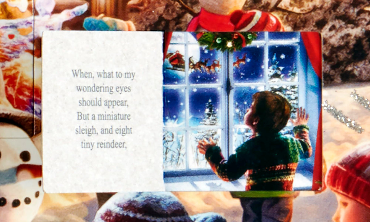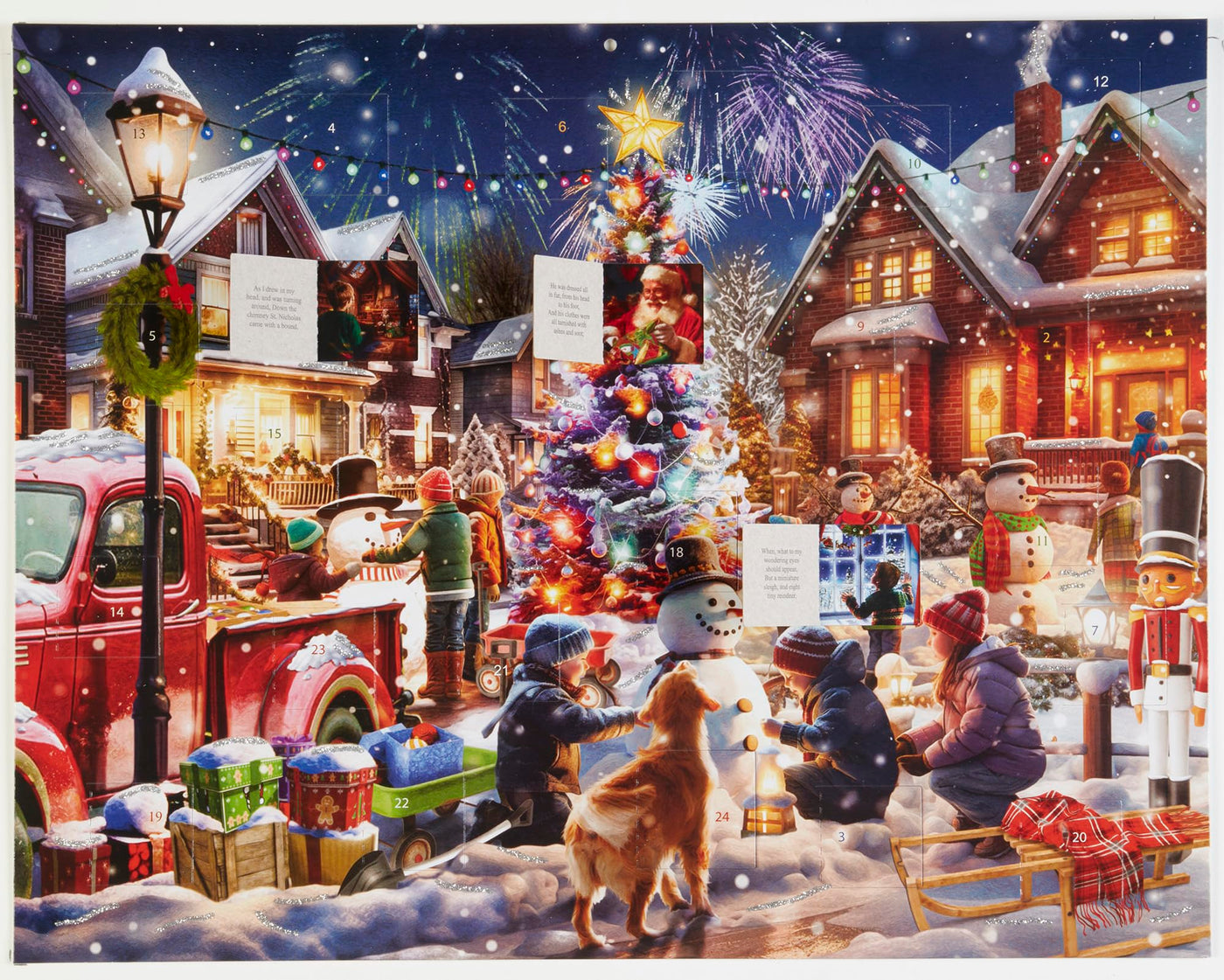 Advent calendars, also sometimes called countdown to Christmas calendars, help build the anticipation for Christmas. This traditional Advent calendar, made of paperboard, has 24 windows to be opened each day beginning on December 1. Behind each window, find a special holiday picture and a verse from Twas the Night Before Christmas. The front is accentuated with glitter, and the calendar measures 14x11. The lovely artwork for this design was created Rafael Trujillo. Easy to hang or display anywhere. Rekindle an old family tradition or start a new one!