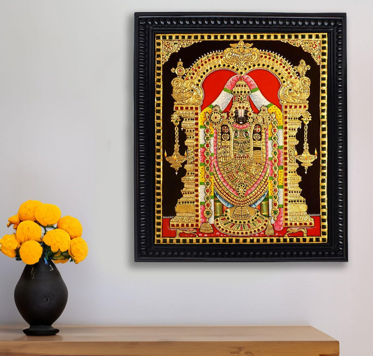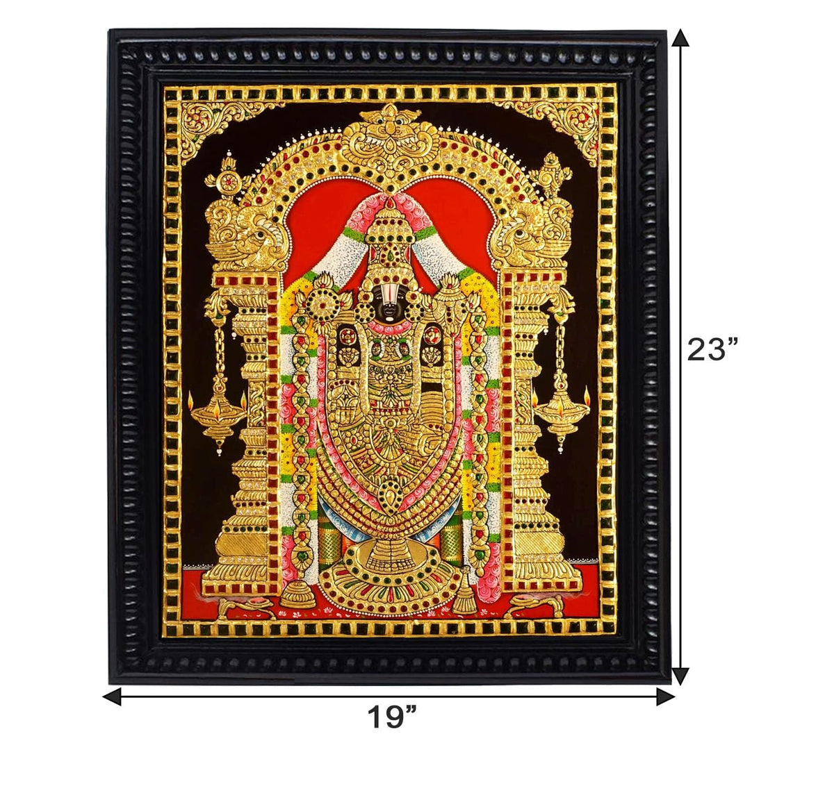 Tarang Arts Lord Tirupati Balaji Tanjore Paintings With Wooden Mani Frame, 3D Embose Design, 22-Carat Gold Foil & Jaipur Stones