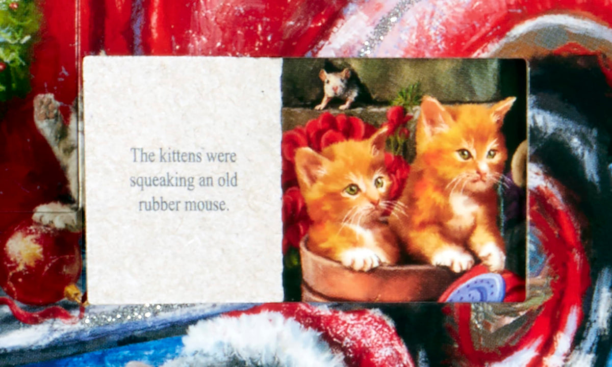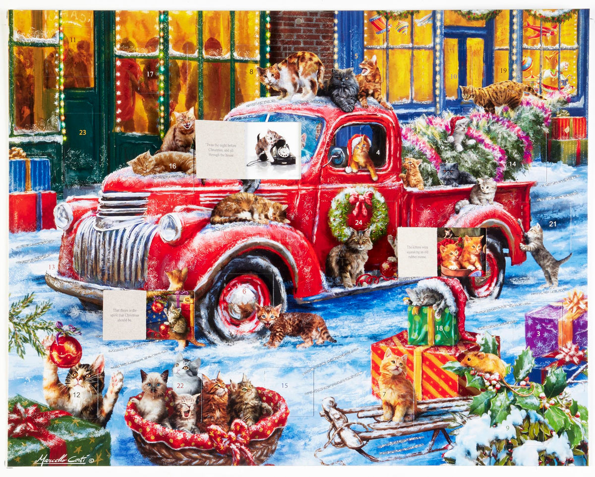 Advent calendars, also sometimes called countdown to Christmas calendars, help build the anticipation for Christmas. This traditional Advent calendar, made of paperboard, has 24 windows to be opened each day beginning on December 1. Behind each window, find a fun holiday picture and a verse from A Kittens Christmas (a fun feline version of Twas the Night Before Christmas). The front is accentuated with glitter, and the calendar measures 14x11. The lovely artwork for this design was created Marcello Corti. Easy to hang or display anywhere. Rekindle an old family tradition or start a new one! Does NOT contain chocolate.