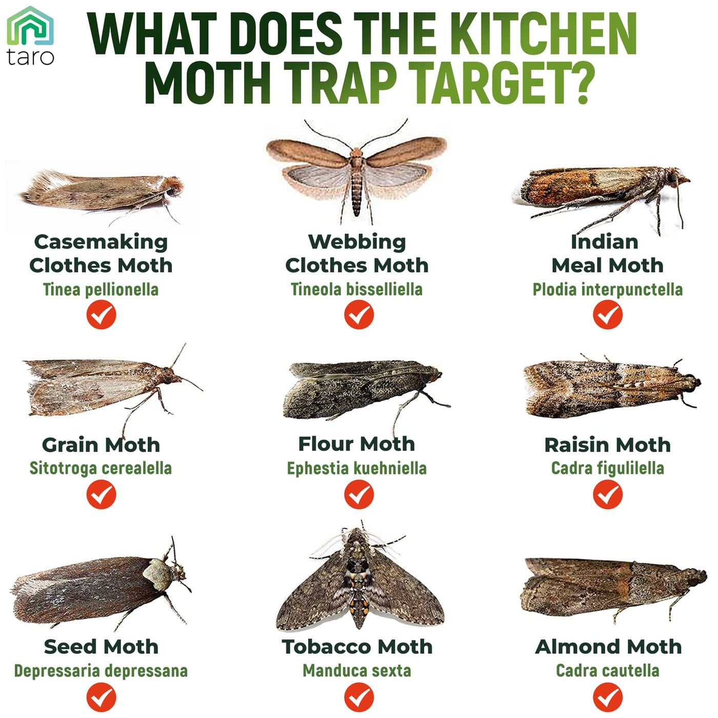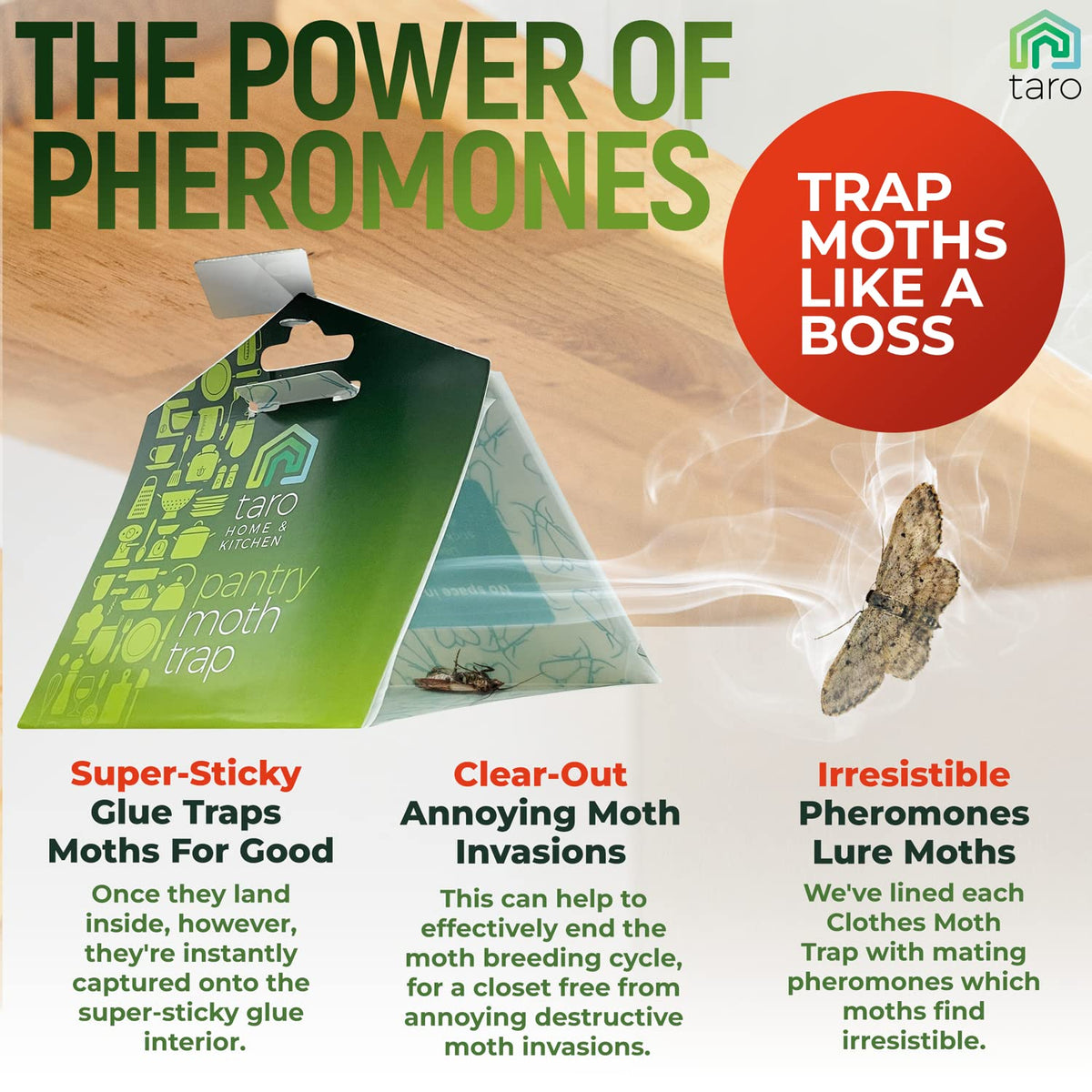 - Q: How do I use the Taro moth traps? A: To use the Taro moth traps, simply remove the protective film and place one trap in your kitchen or pantry. You can also use the included hangers to save space. Results can typically be seen within 72 hours.