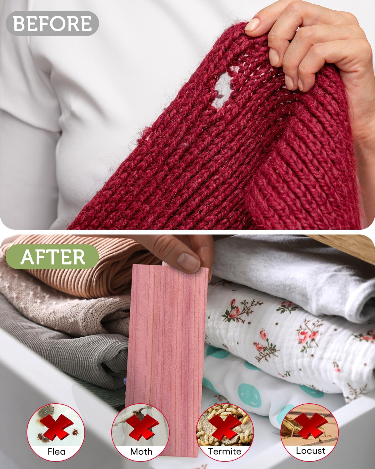 • Q: Do the cedar blocks have any chemical additives? A: No, the cedar blocks are made from 100% natural cedar wood without any chemical additives, making them a safe option for protecting your clothes.