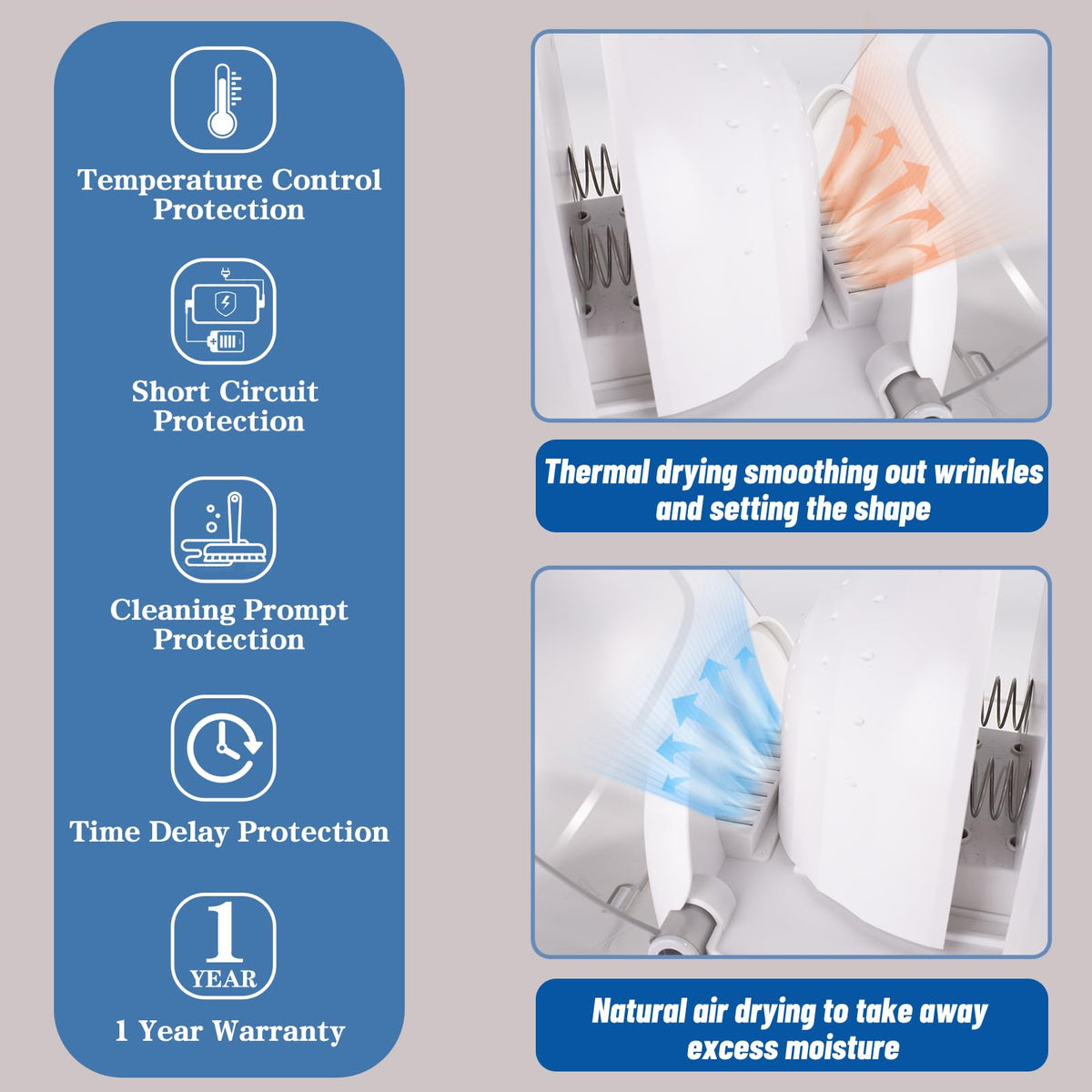 - Q: How does the automatic cleaning and drying process work? A: The machine operates with an automatic button that initiates a 30-minute cycle, combining 5 minutes of steam cleaning and ironing, 10 minutes of thermal drying, and 5 minutes of natural air drying.