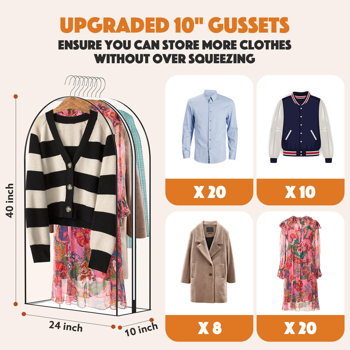 - Q: Can these garment bags accommodate bulky items? A: Yes, the upgraded 10-inch gussets can hold 20 shirts, 10 jackets, 8 winter coats, and 20 knee-length dresses, providing ample storage.