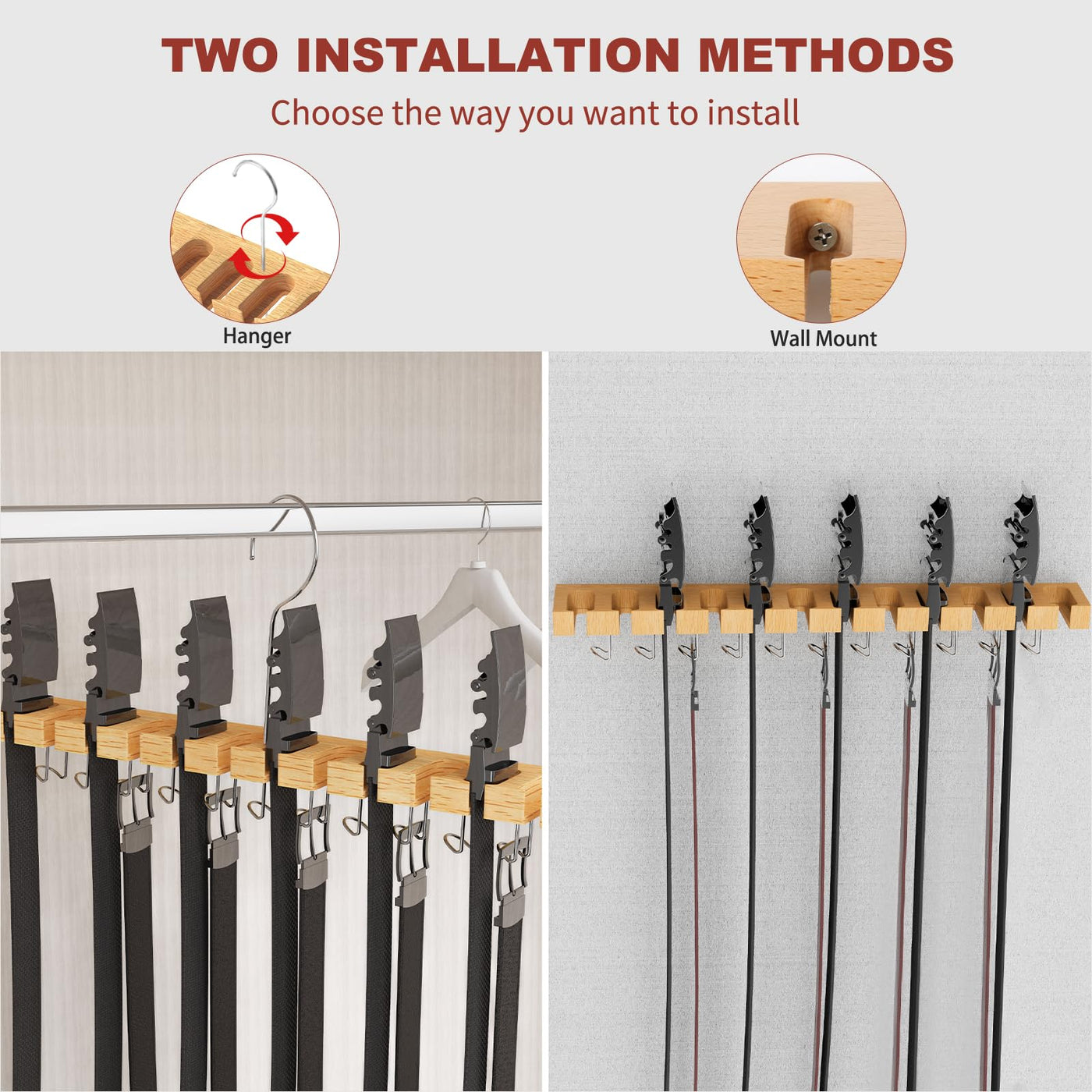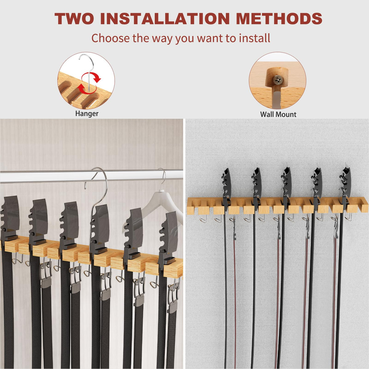 Belt Hanger For Closet Max 42 Belts, 2-In-1 Wall Mount Belt Organizer With 360 Rotating Hooks, Wooden Tie And Belt Rack For Clos