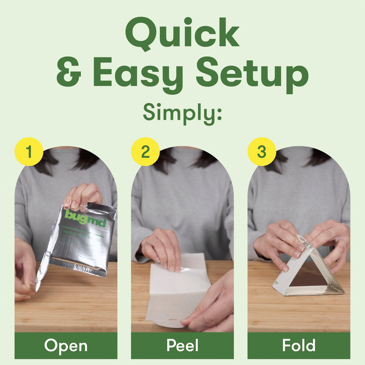 - Q: How do I use the BugMD Pantry Pest Patrol traps? A: To use the BugMD Pantry Pest Patrol traps, open the individual trap package, peel off the protective sheet, fold the trap, and tuck the tab into place. Place the traps in areas where you suspect pantry moths may be present.
