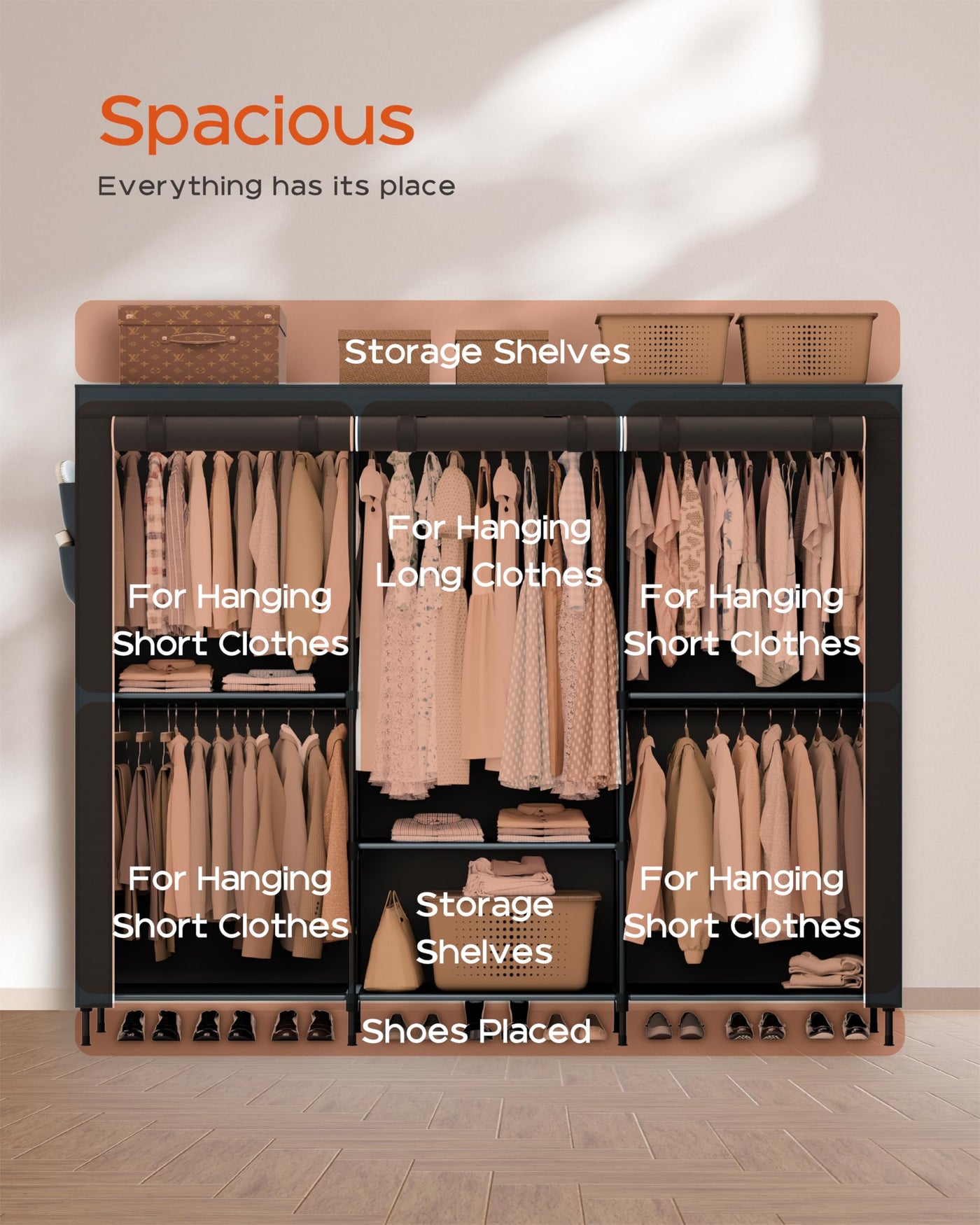 • Q: Can this closet accommodate both short and long clothes? A: Yes, the closet features a raised hanging height of 34.6 inches for short clothes and 52 inches for long clothes, preventing wrinkles.