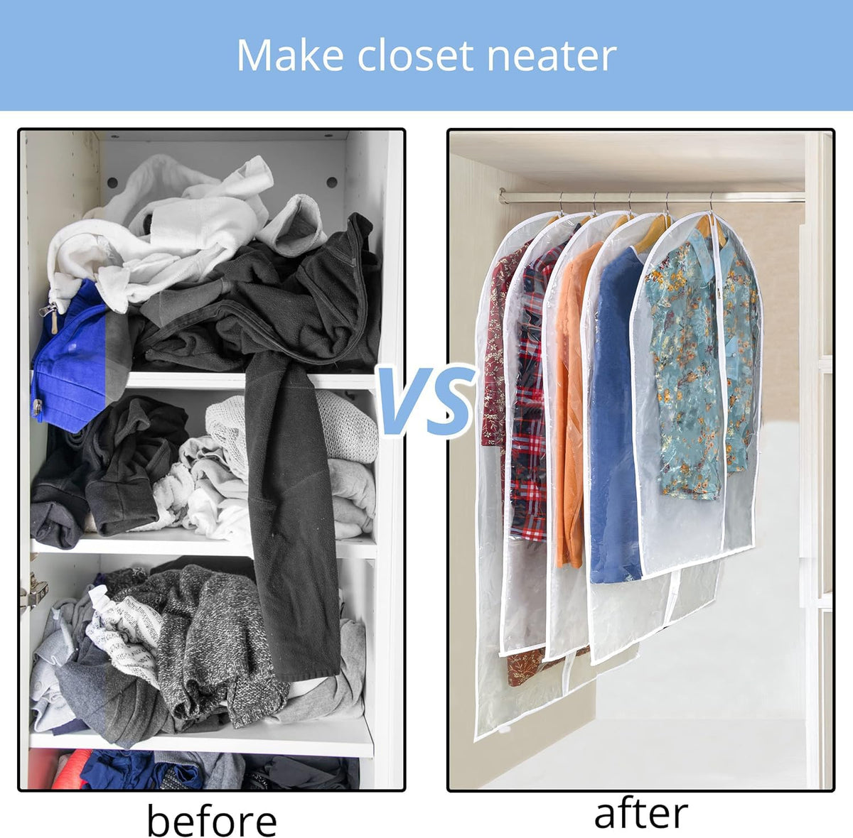 - Q: Are these garment bags suitable for storage in a closet? A: Yes, these clear garment bags are specifically designed for closet storage, providing protection and organization for your garments while keeping them visible.