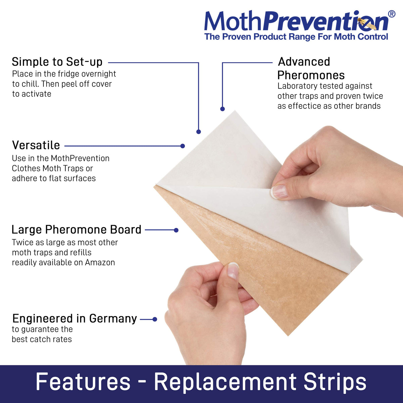 - Q: How do I use the MothPrevention moth trap refills? A: To use the MothPrevention moth trap refills, simply open the package, peel off the protective backing, fold the strip, and place it in the moth trap. You can also hang it on your closet rail using the included hook.