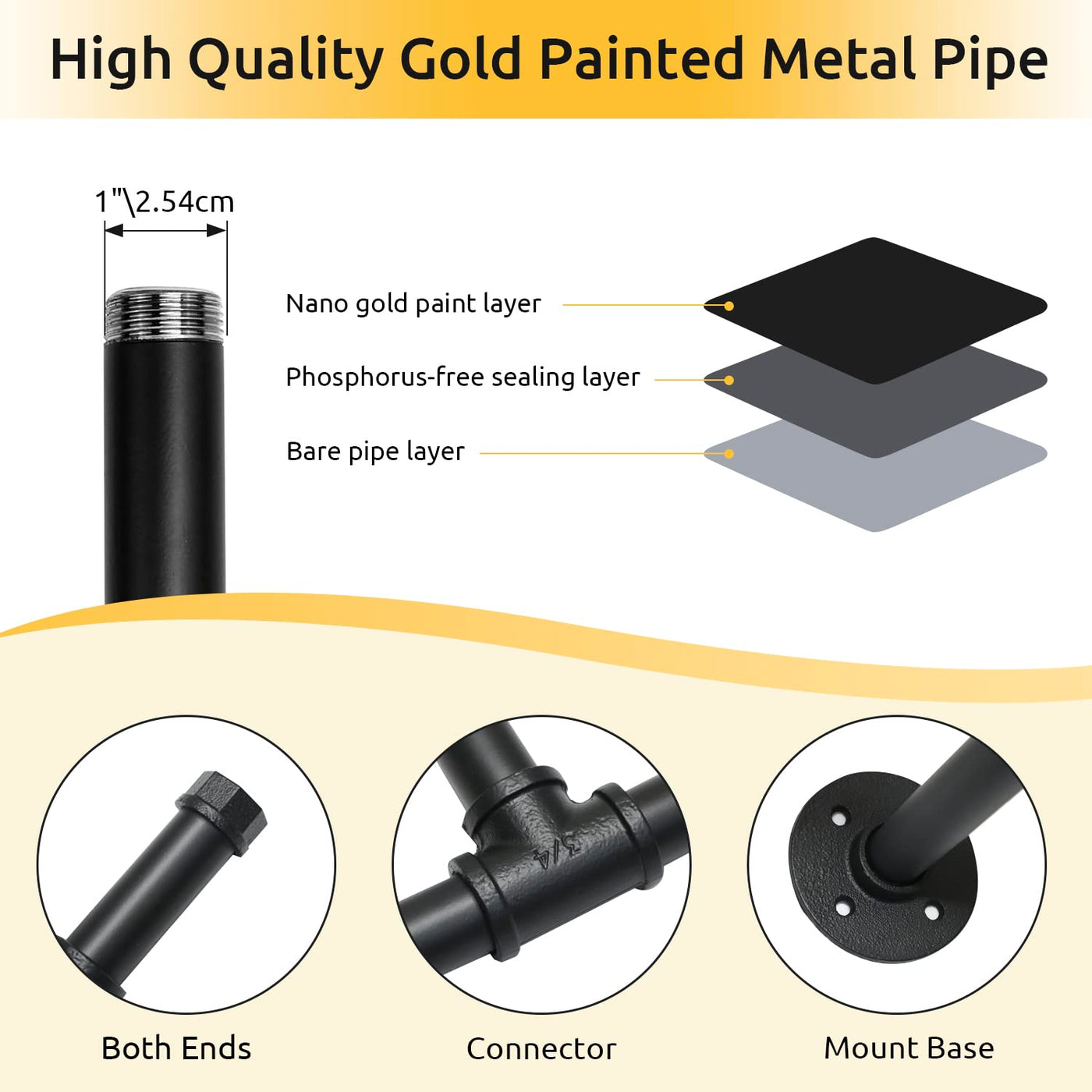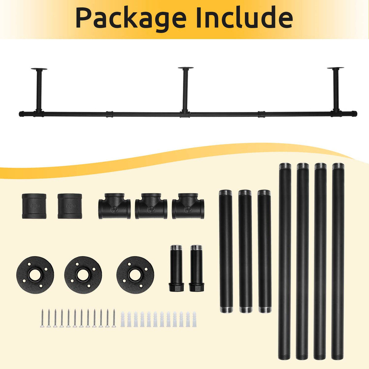 • Q: What materials is the clothes rack made from? A: The clothes rack is made of galvanized steel pipe with a black powder-coated surface for durability and a vintage look.