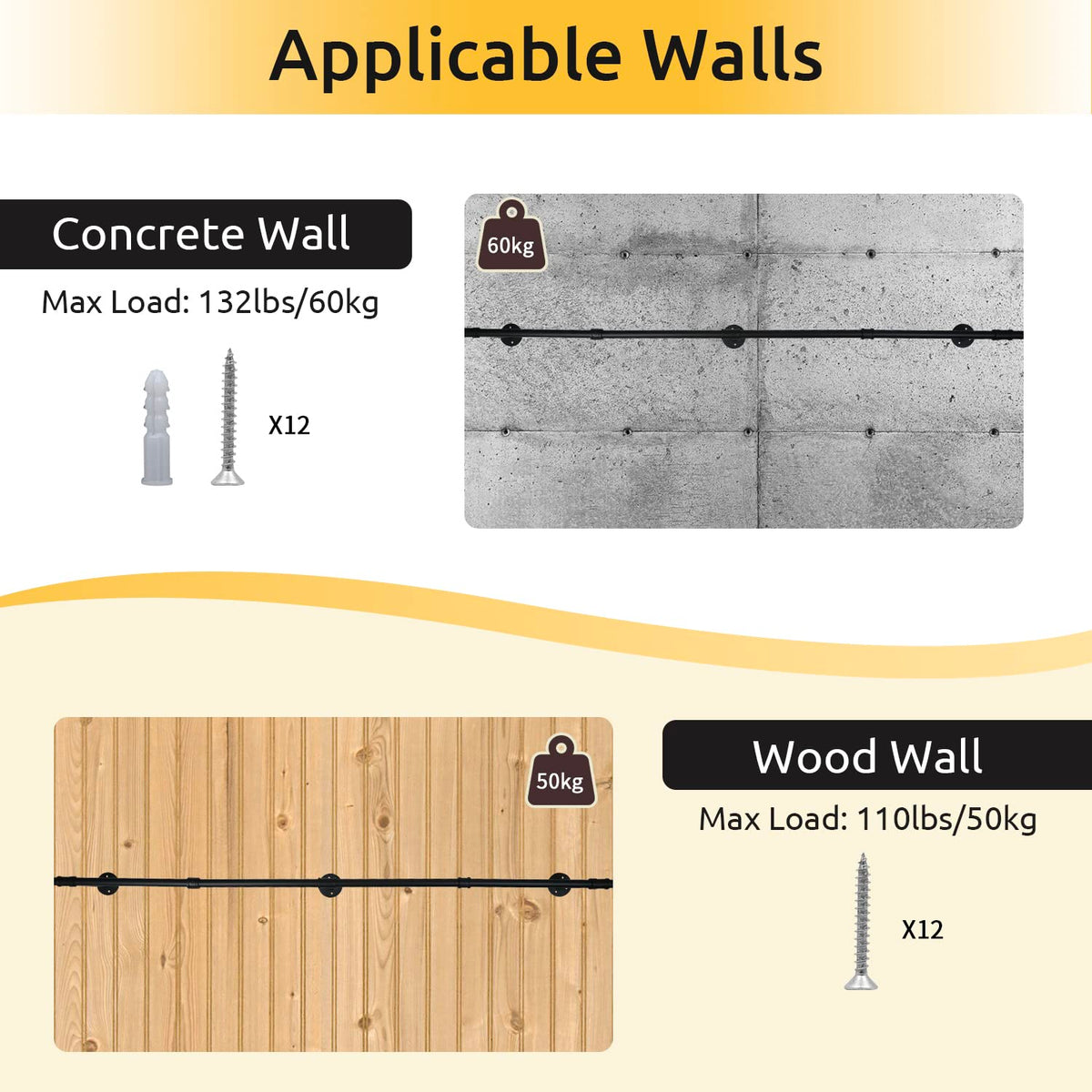 • Q: How many wall mount bases does the rack come with? A: The Oroonoko garment rack comes with three wall mount bases for secure installation.