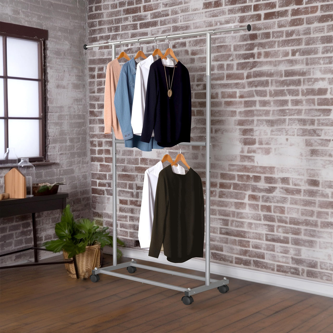 • Q: What are the dimensions of the Simple Houseware Double Rod Garment Rack? A: The dimensions of the Simple Houseware Double Rod Garment Rack are 48.25 inches wide, 16.75 inches deep, and 68 inches high.