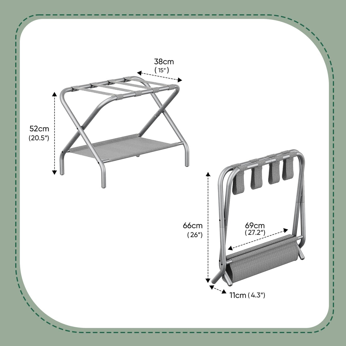 - Q: Does the luggage rack have any additional storage features? A: Yes, the luggage rack includes an extra bottom storage area that can be used for shoes, clothes, or other room accessories.