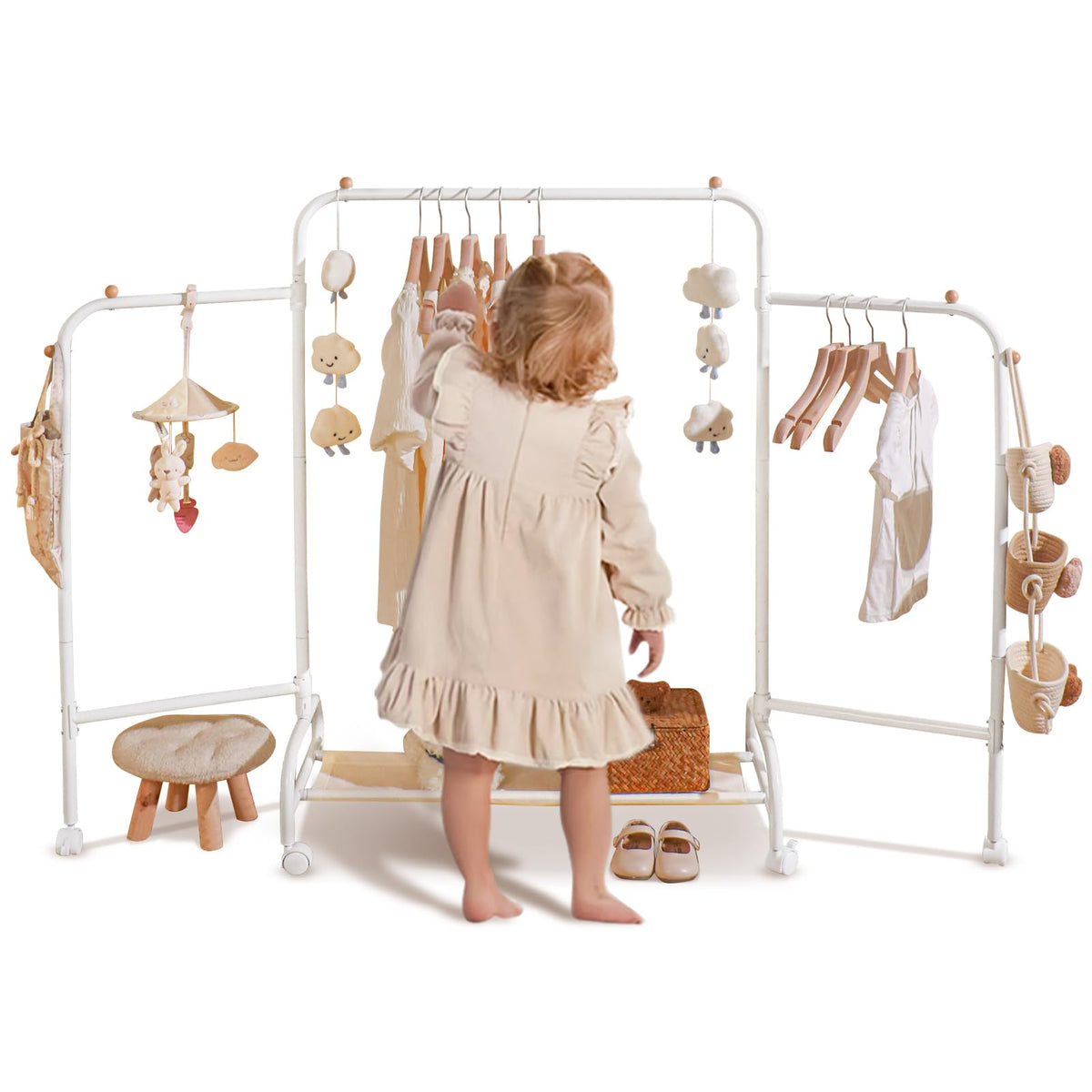 A nice kids dress up clothes storage for playroom, toddlers bedroom, laundry room, nursery while doesnt take up much space; baby gilr clothes rack will be great for kids birthday shower, Christmas, The stylish design will surely be loved by kids, natural color well matches with any room decor