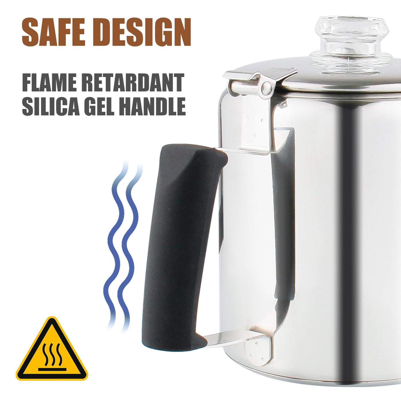 - Q: What features make this coffee pot easy to use? A: It features an anti-slip fireproof silicone handle, a drip-free spout, and a wide hinged lid for easy filling and cleaning.
