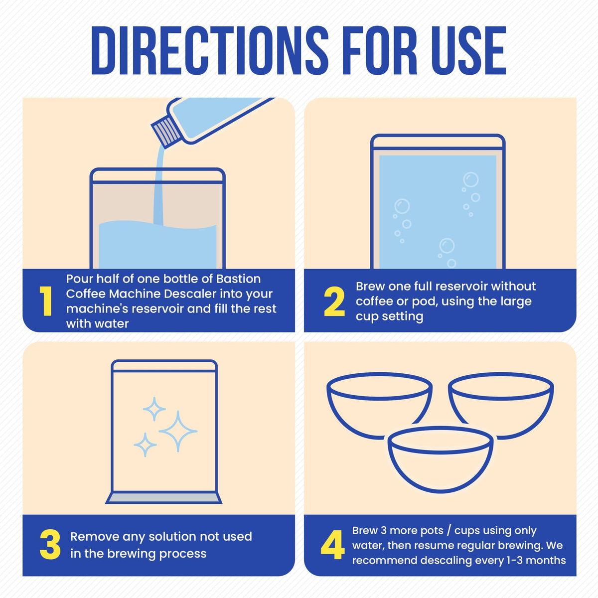 - Q: How do I use the Bastion Coffee Machine Descaler? A: To use, simply follow the provided instructions: mix the descaler with water, pour it into the water reservoir, and run a cleaning cycle without coffee pods.
