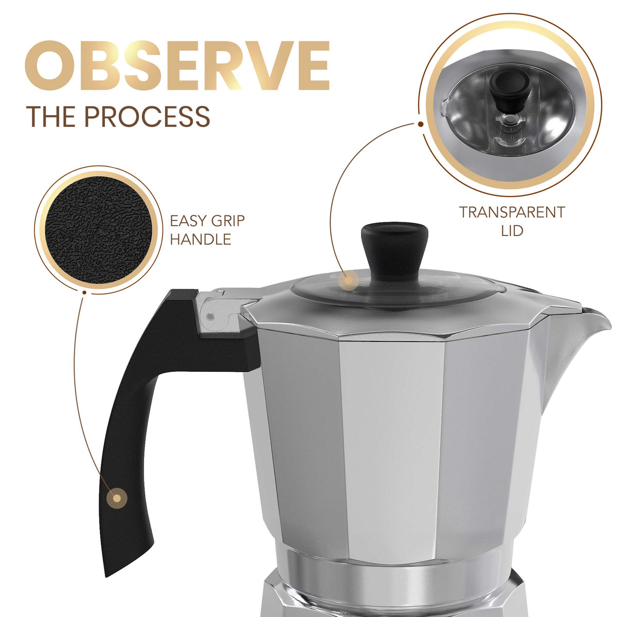 • Q: What features make this moka pot safe and easy to use? A: The moka pot features a heat-resistant handle for secure pouring and a compact design that fits easily into small spaces, making it safe and convenient to handle.