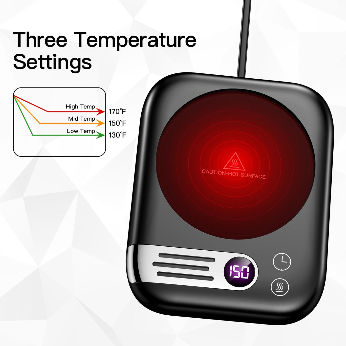 - Q: What are the temperature settings available for this coffee mug warmer? A: The coffee mug warmer features three temperature settings: 130°F, 150°F, and 170°F, allowing you to choose your preferred beverage temperature.