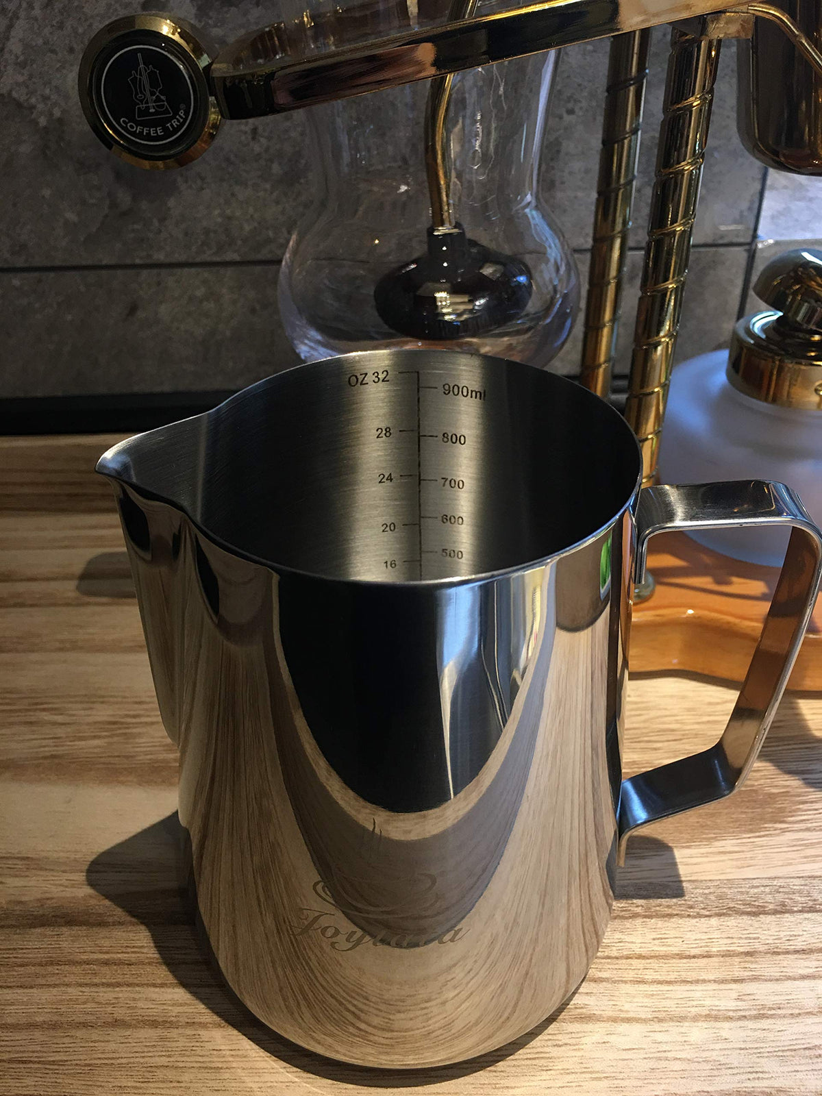 - Q: What is the capacity of the Joytata Milk Frothing Pitcher? A: The Joytata Milk Frothing Pitcher has a capacity of 32 ounces, which is approximately 900 milliliters.