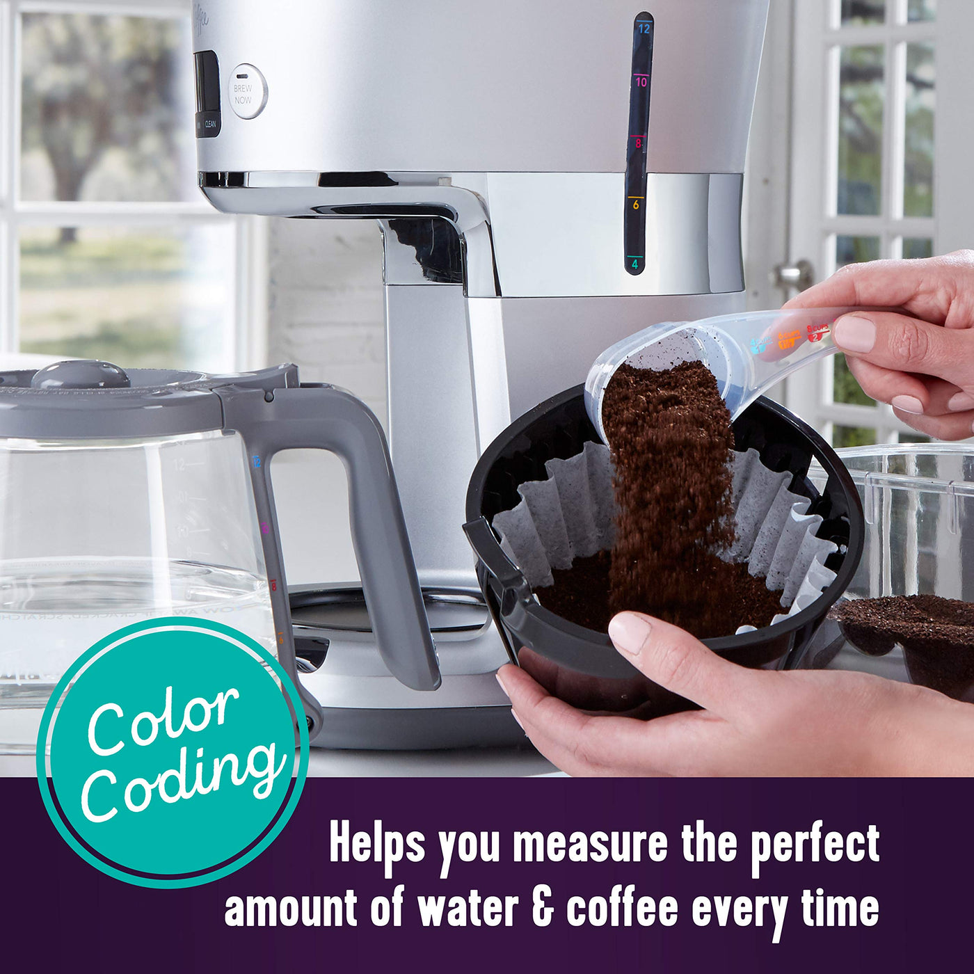 - Q: How does the color-coded measuring system work? A: The color-coded measuring system on the scoop, carafe, and water reservoir helps you easily measure the right amount of coffee grounds and water for optimal brewing.