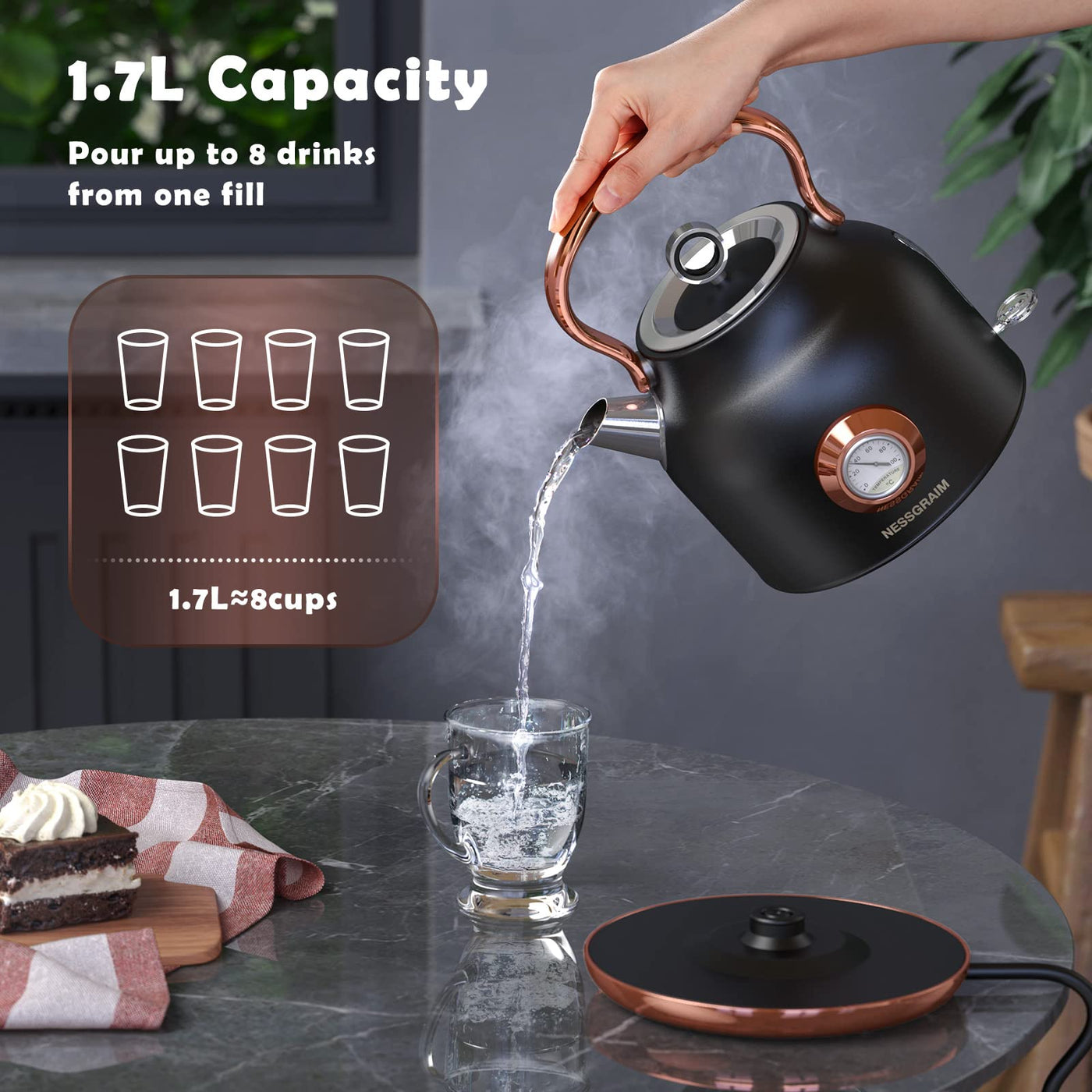 Nessgraim Retro Electric Kettle, 1.7L Stainless Steel Tea Kettle With Large Temperature Gauge, 1500W Fast Heating Hot Water Boil