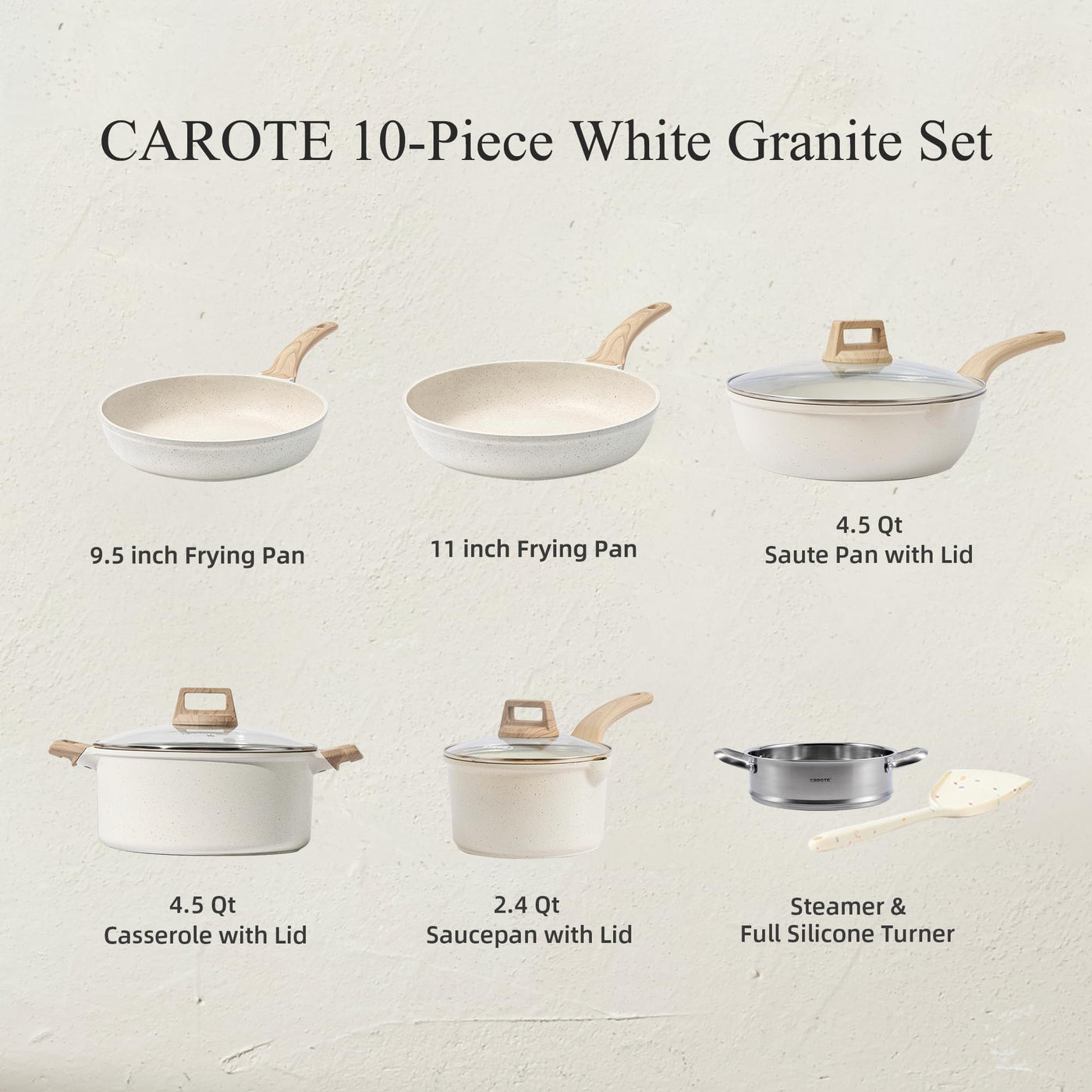 CAROTE Pots and Pans Set Nonstick, White Granite Induction Kitchen Cookware Set, 10 Pcs Non Stick Cooking Set w/Frying Pans & Sa