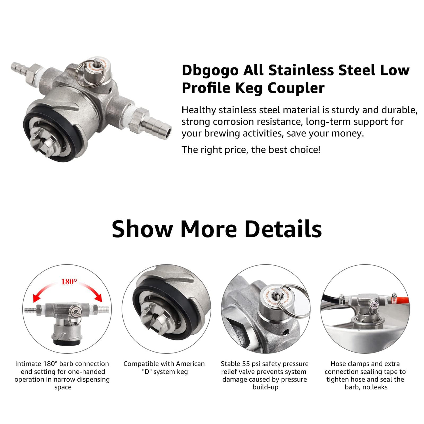 Dbgogo Low Profile Keg Coupler, 304 Stainless Steel D System Keg Coupler Space Saving Twist-Activated Homebrew Sankey Keg Tap Wi
