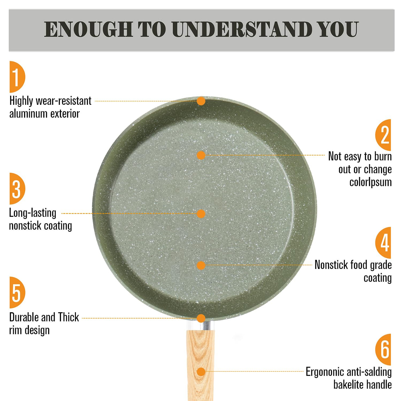 • Q: What materials are used in this cookware? A: The cookware features an aluminum core for quick heating and even heat distribution, along with a granite nonstick coating.