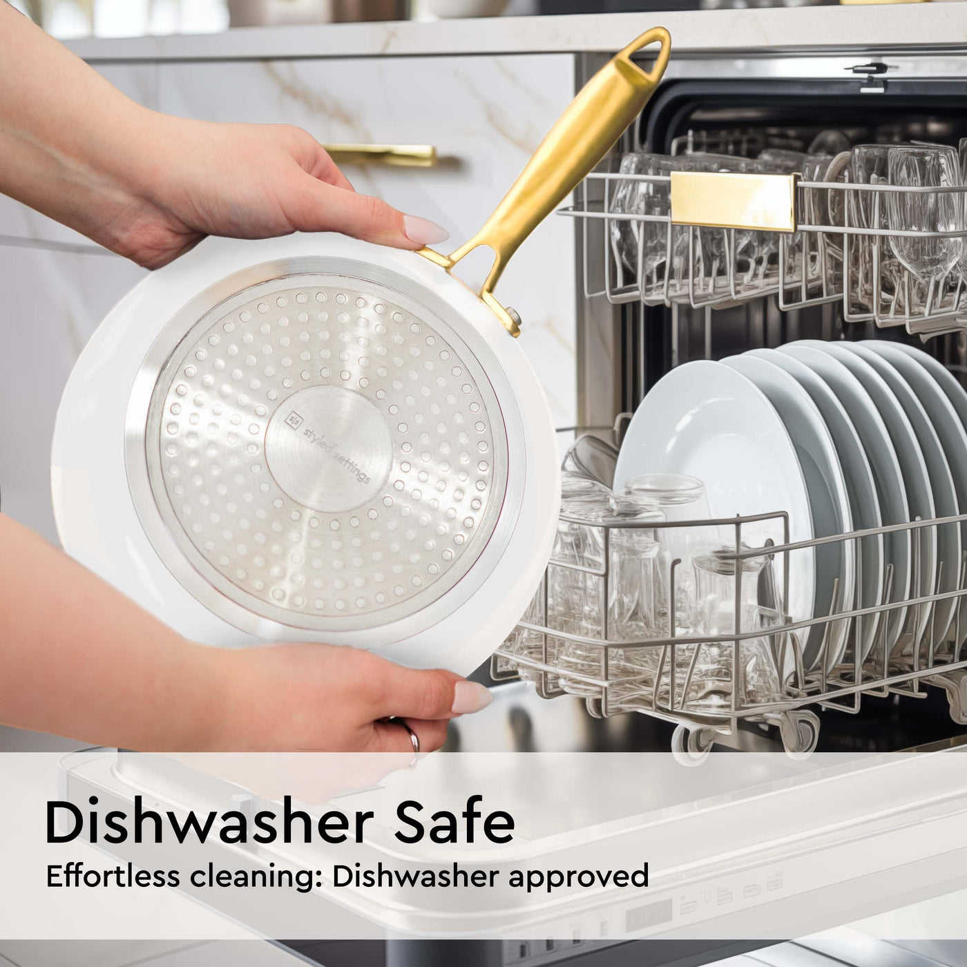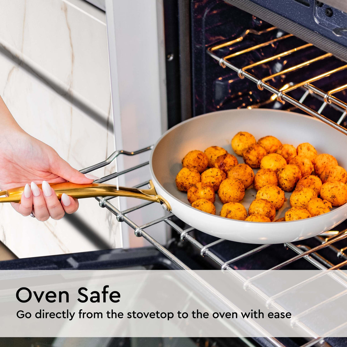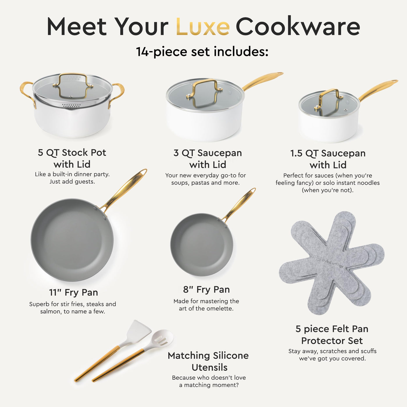- Q: What colors does this cookware set come in? A: The set features an elegant white and gold color scheme, making it a stylish addition to any kitchen.