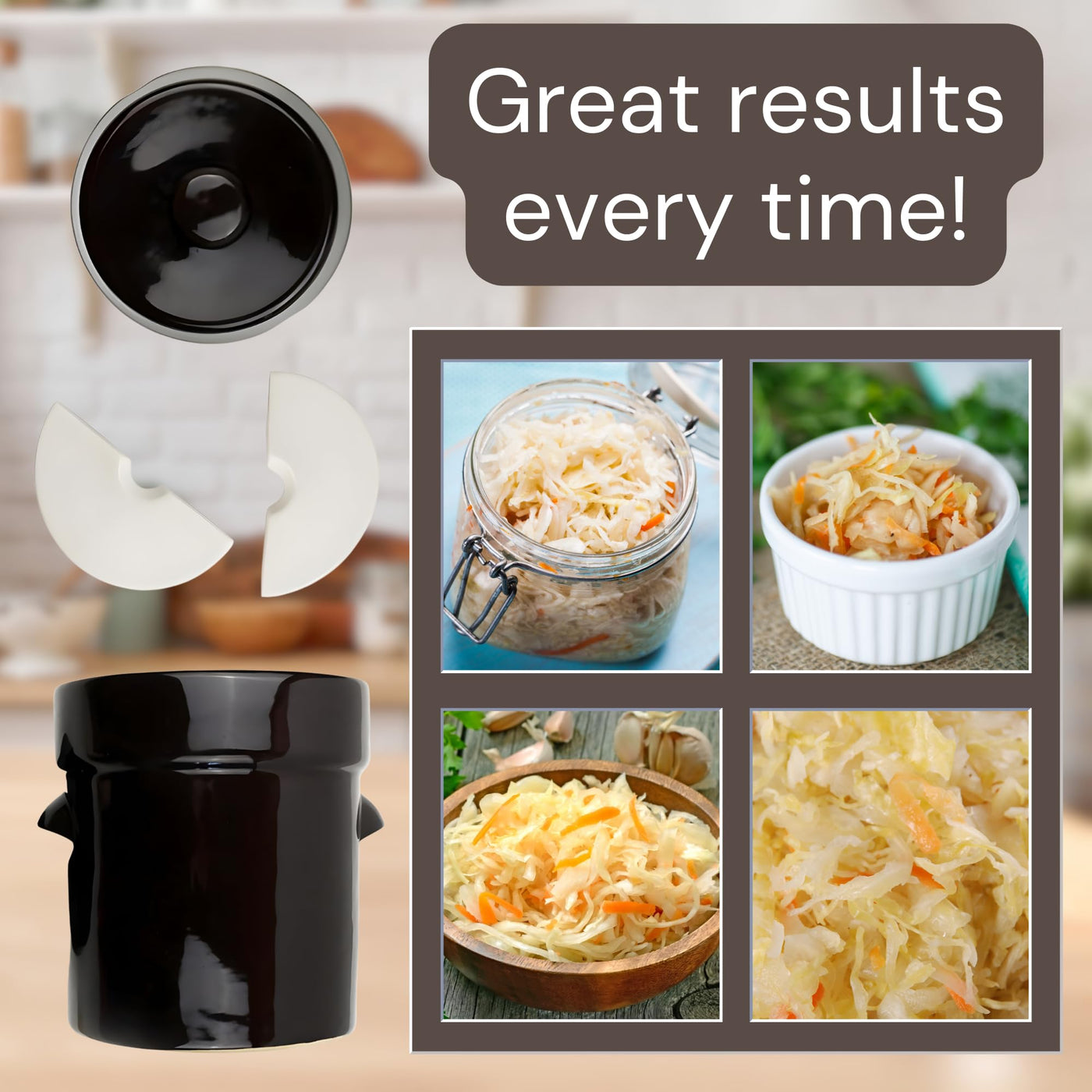 • Q: What is included in the fermentation kit? A: The fermentation kit includes the 1/2 gallon ceramic crock, a wood cabbage tamper measuring 11.75 inches, and two fully glazed weights to keep your vegetables submerged during fermentation.
