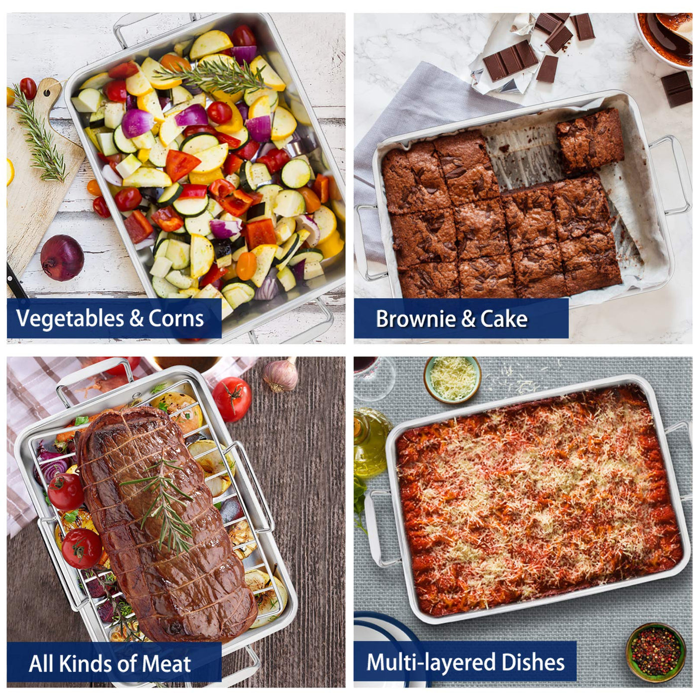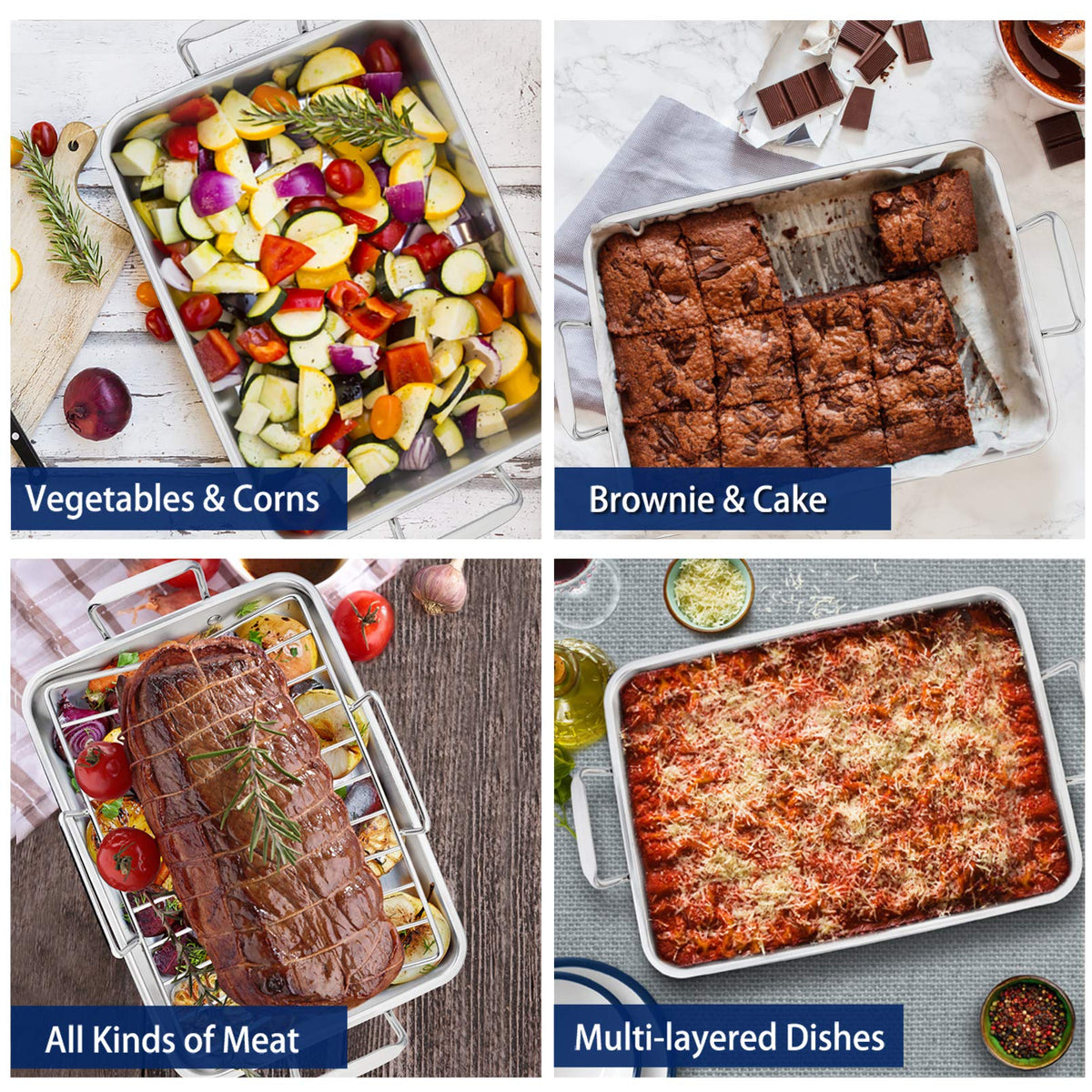• Q: Can I use this roasting pan for baking lasagna? A: Yes, the P&P CHEF roasting pan is perfect for baking lasagna, along with vegetables and other multi-layered dishes.