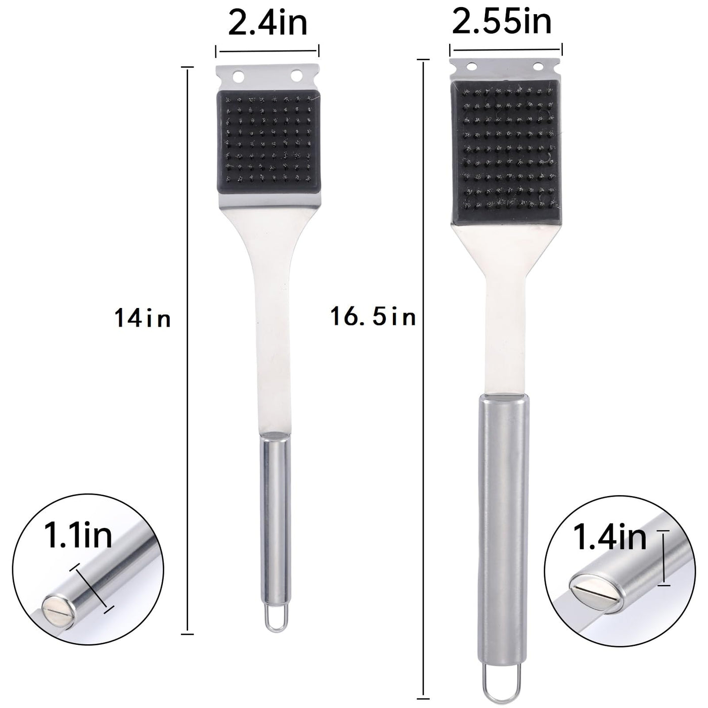 - Q: What sizes do the grill brushes come in? A: The product includes two grill brushes: one measuring 16.5 inches and another measuring 14 inches, allowing for versatile cleaning options.