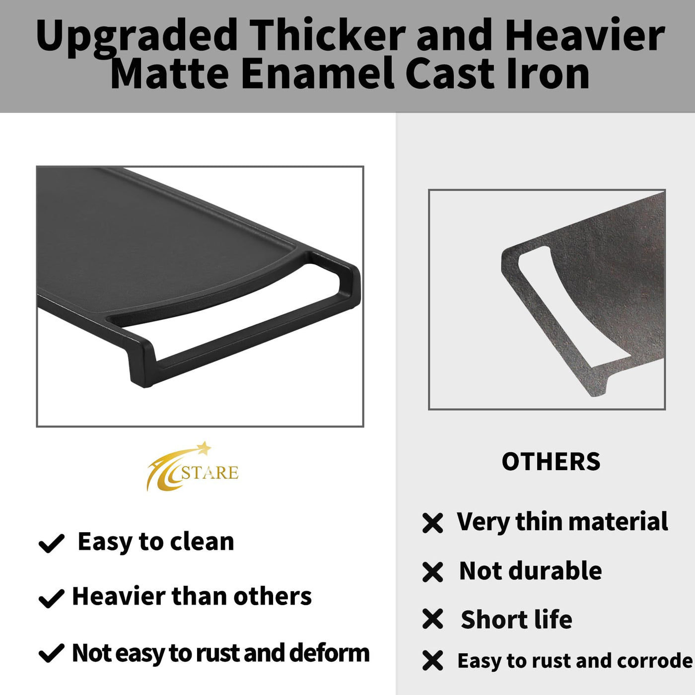 - Q: What makes this griddle heavier and more durable than others? A: The Allstare griddle is made from thicker matte enamel cast iron, which enhances its durability and ability to retain and distribute heat evenly.