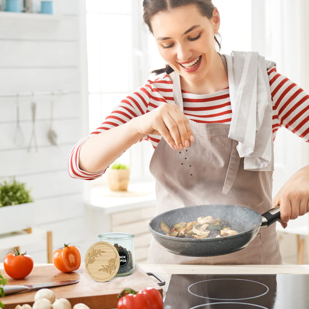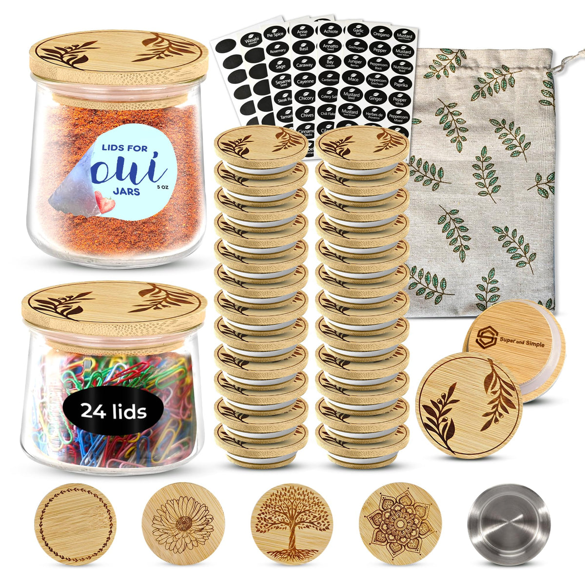 - Q: What comes with the Oui yogurt jar lid set? A: The set includes 24 bamboo Oui jar lids, 144 waterproof chalkboard labels (98 with spice names and 46 blank), and a reusable cotton and linen drawstring storage bag.