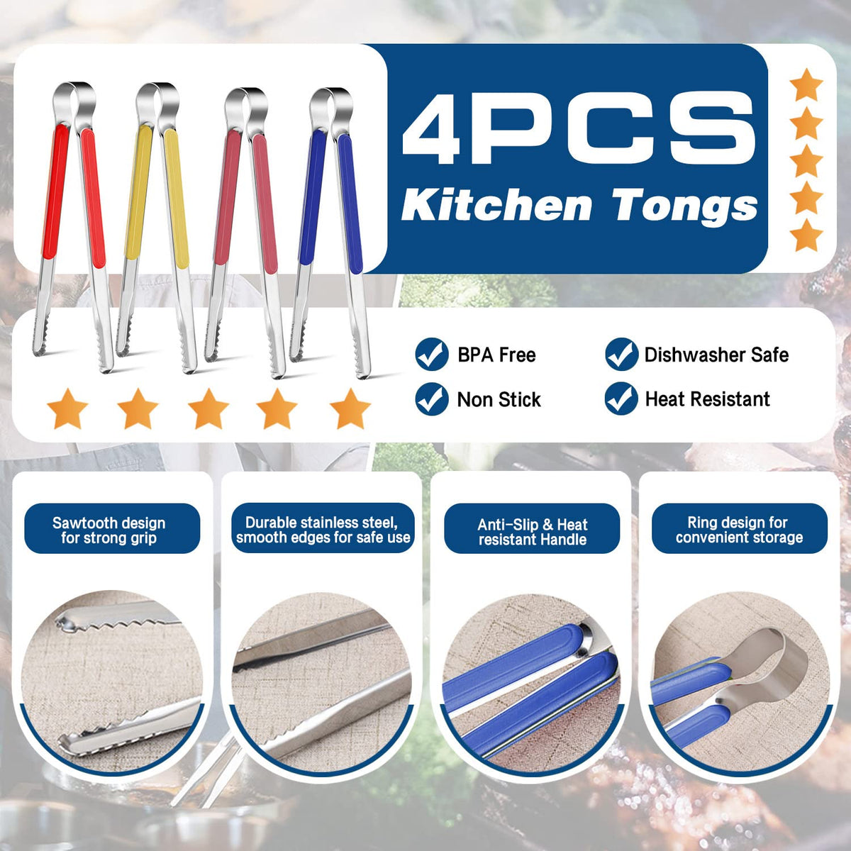 4Pcs Stainless Steel Kitchen Tongs, Serving Tongs For Cooking, 10 '' Metal Food Tongs With Non-Slip Comfort Grip, Non-Stick Cook