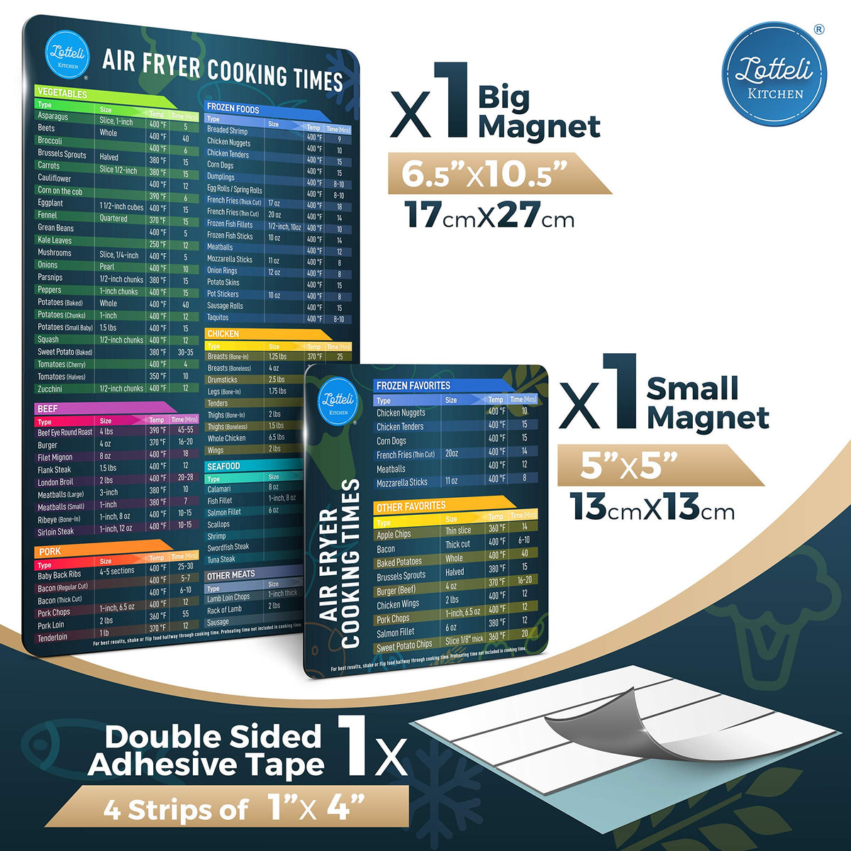 - Q: What is included in the Air Fryer Magnetic Cheat Sheet Set? A: The Air Fryer Magnetic Cheat Sheet Set includes two cooking essential magnetic cheat sheets: a large magnet measuring 10.5 x 6.5 inches and a small magnet measuring 5 x 5 inches, both designed to provide cooking times, temperatures, and portion sizes for over 100 foods.