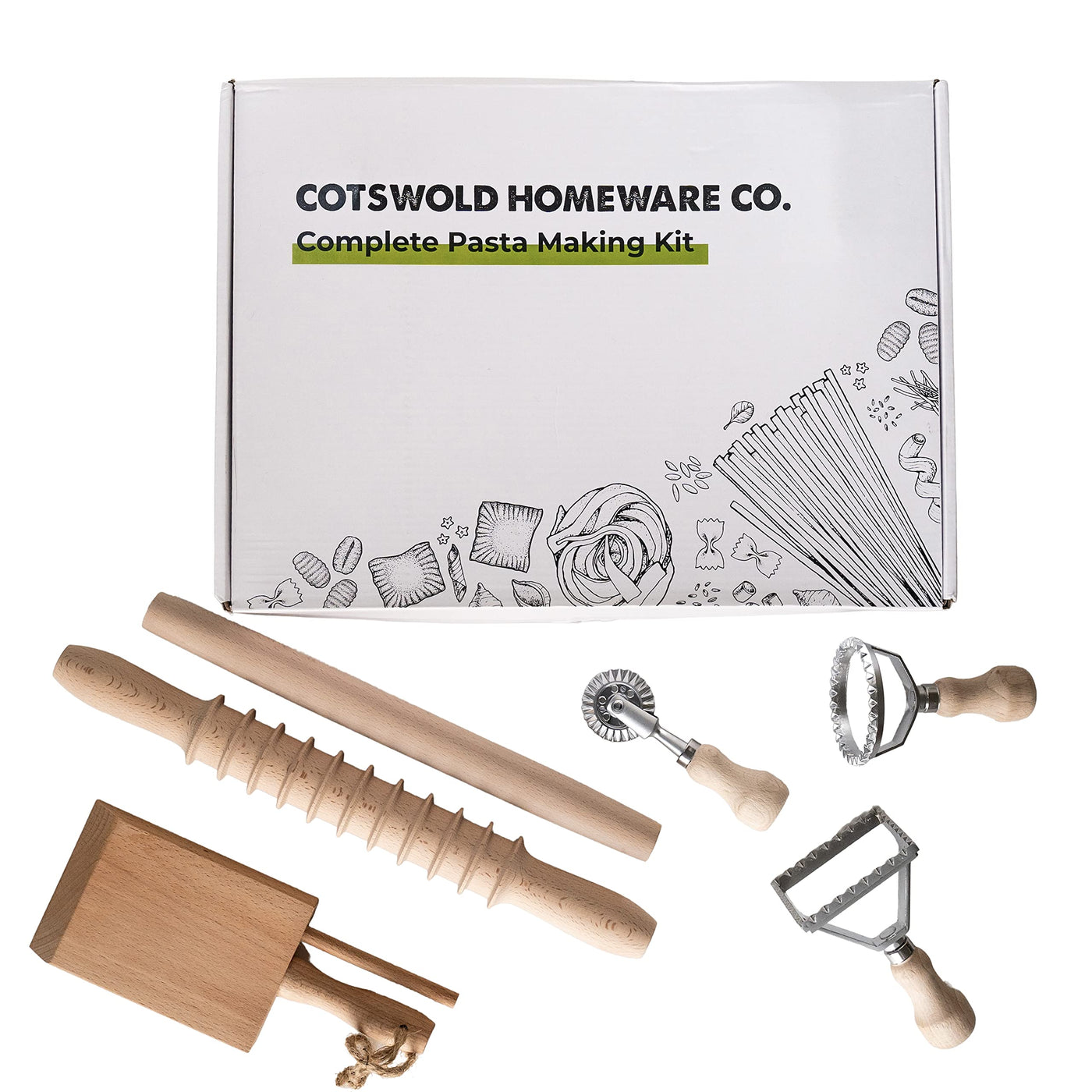 • Q: What is included in the Complete 6 Pcs Pasta Making Tool Set? A: The set includes two ravioli stamp makers (one round and one square), a roller wheel cutter, two pasta rolling pins, and a wooden gnocchi board.