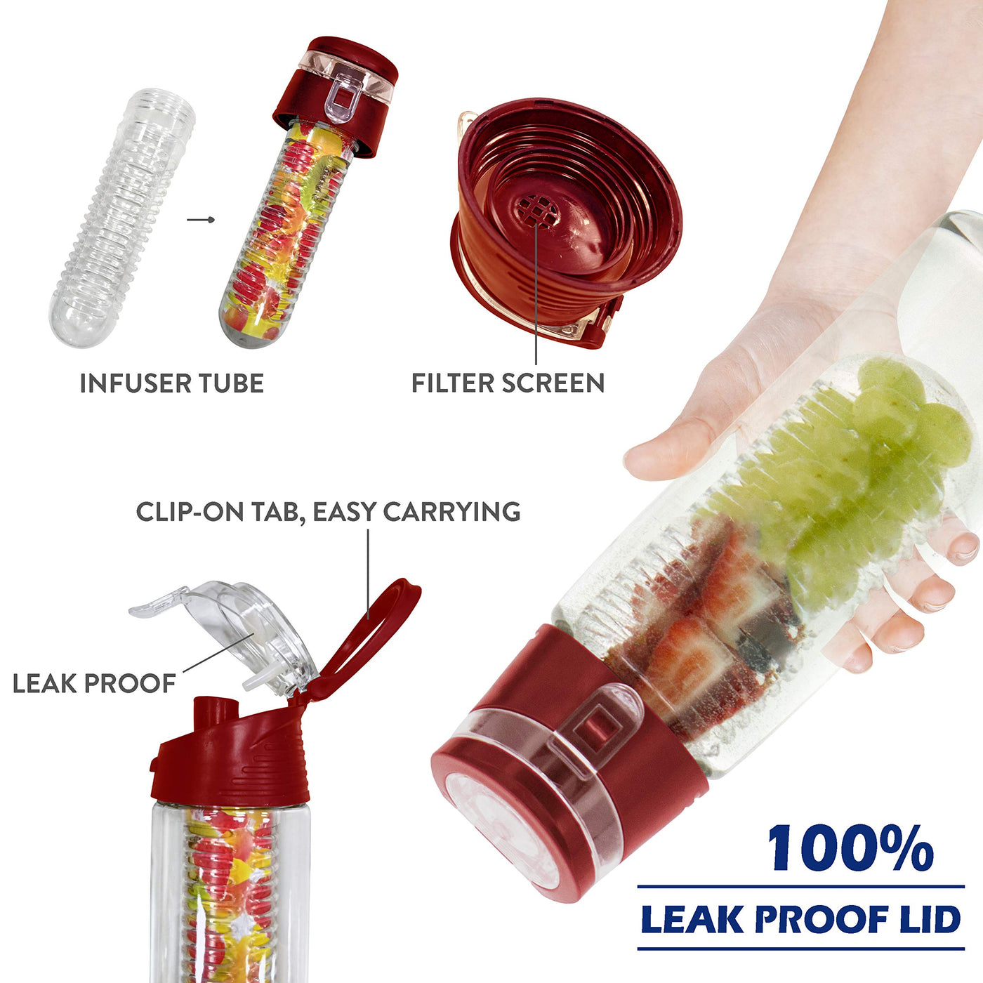 • Q: What materials are used in the construction of the bottle? A: The bottle is made from high-quality plastic, including the body, lid, and infuser tube.