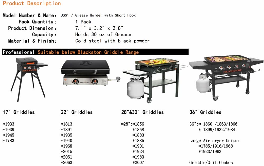 • Q: What sizes of Blackstone griddles are compatible with this grease cup foil tray? A: This grease cup foil tray is designed to fit Blackstone griddles measuring 17 inches, 22 inches, 28 inches, 30 inches, and 36 inches.