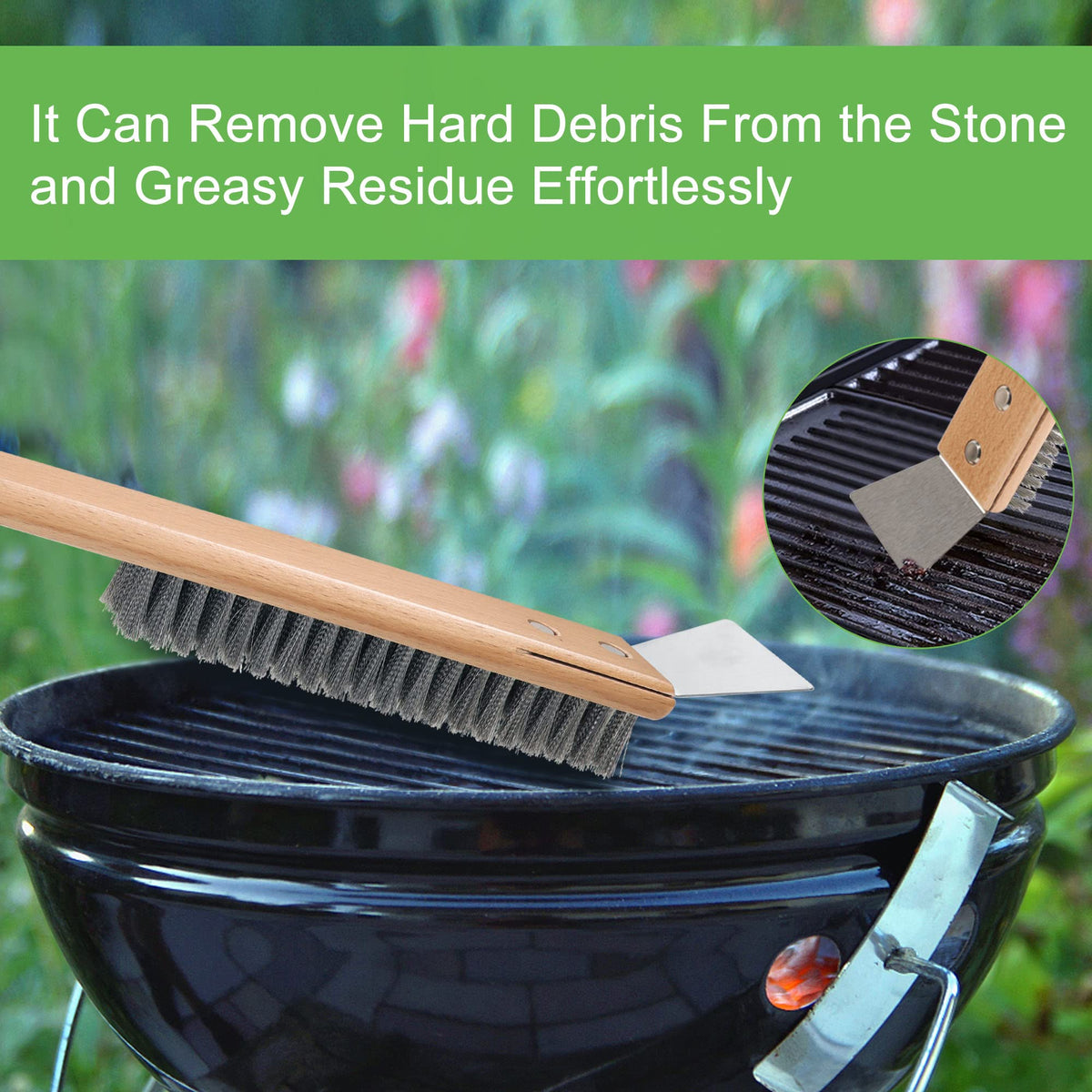 - Q: Is this brush easy to handle? A: Yes, the brush's long handle allows you to maintain a safe distance from the hot oven while providing good leverage for cleaning.