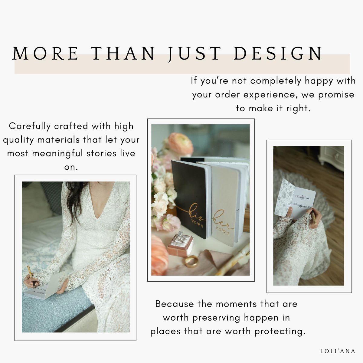 - Q: What colors are available for the vow books? A: The vow books come in a set of two, one in white and one in black, each featuring luxurious gold foil lettering.
