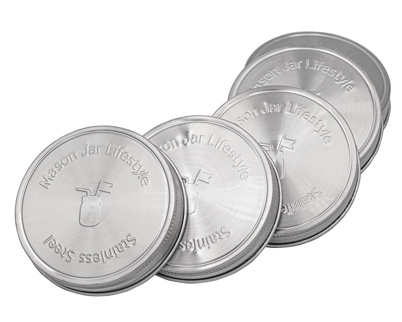 Mason Jar Lifestyle Rust Proof Stainless Steel Storage Lids With Platinum Silicone Liners (5 Pack, Wide Mouth)