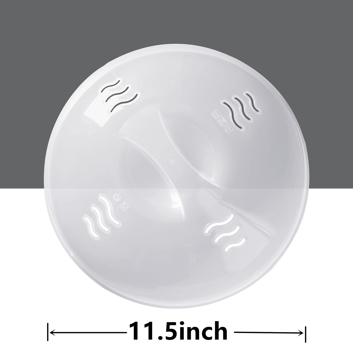 • Q: What is the size of the Microwave Splatter Cover? A: The Microwave Splatter Cover measures approximately 11.5 inches by 11.5 inches and stands 4.5 inches tall.