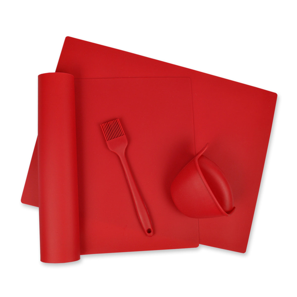 Red 4-Piece Kitchen Baking Set - To Include 2 Silicone Baking Mats, One Oven Gripper And One Basting Brush. Silicone Is Heat Re