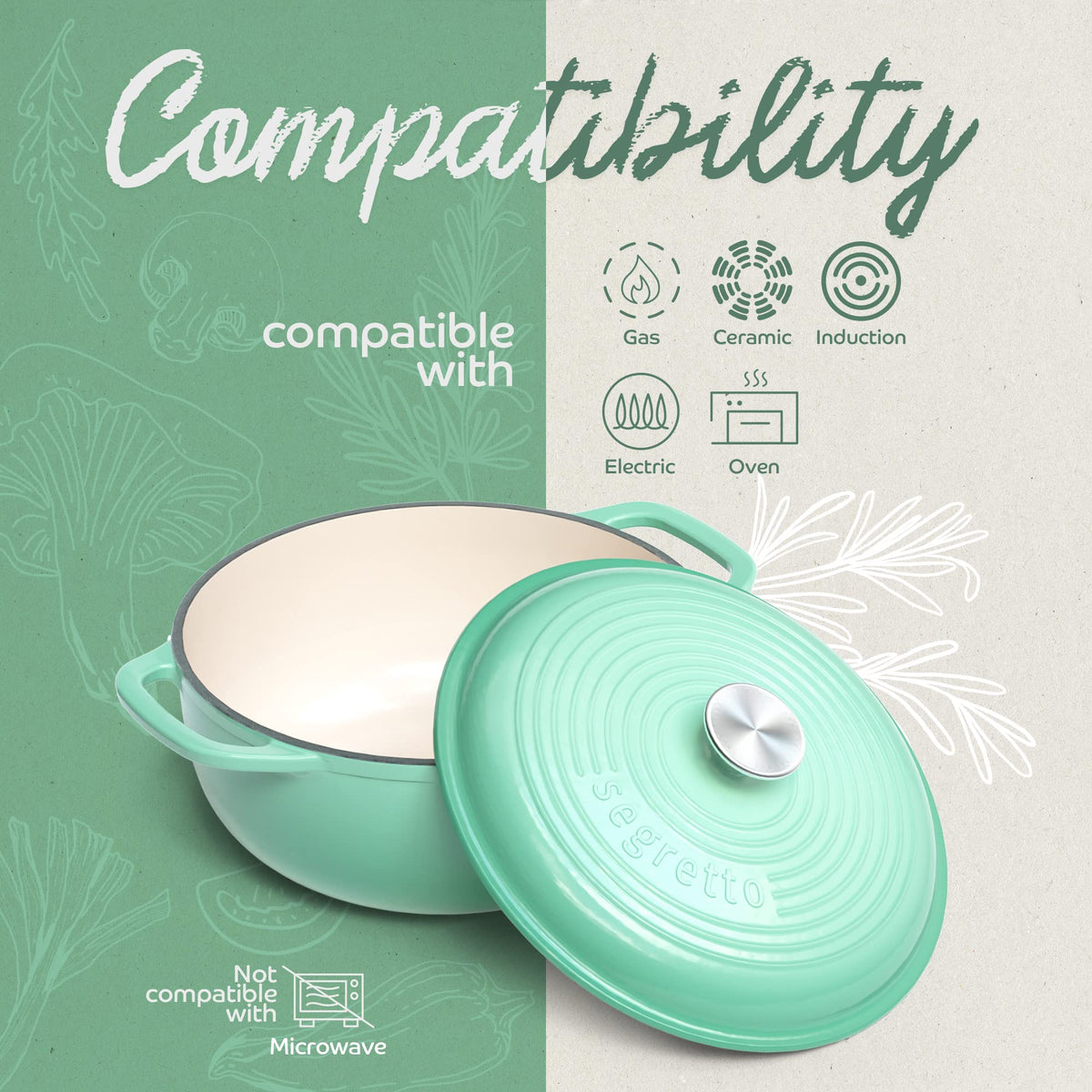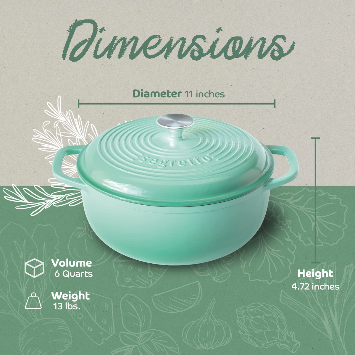 Segretto Cookware Enameled Cast Iron Dutch Oven With Handle, 6 Quarts, Verde Chiaro (Light Green) 6-Quarts Stovetop Oven Cast Ir